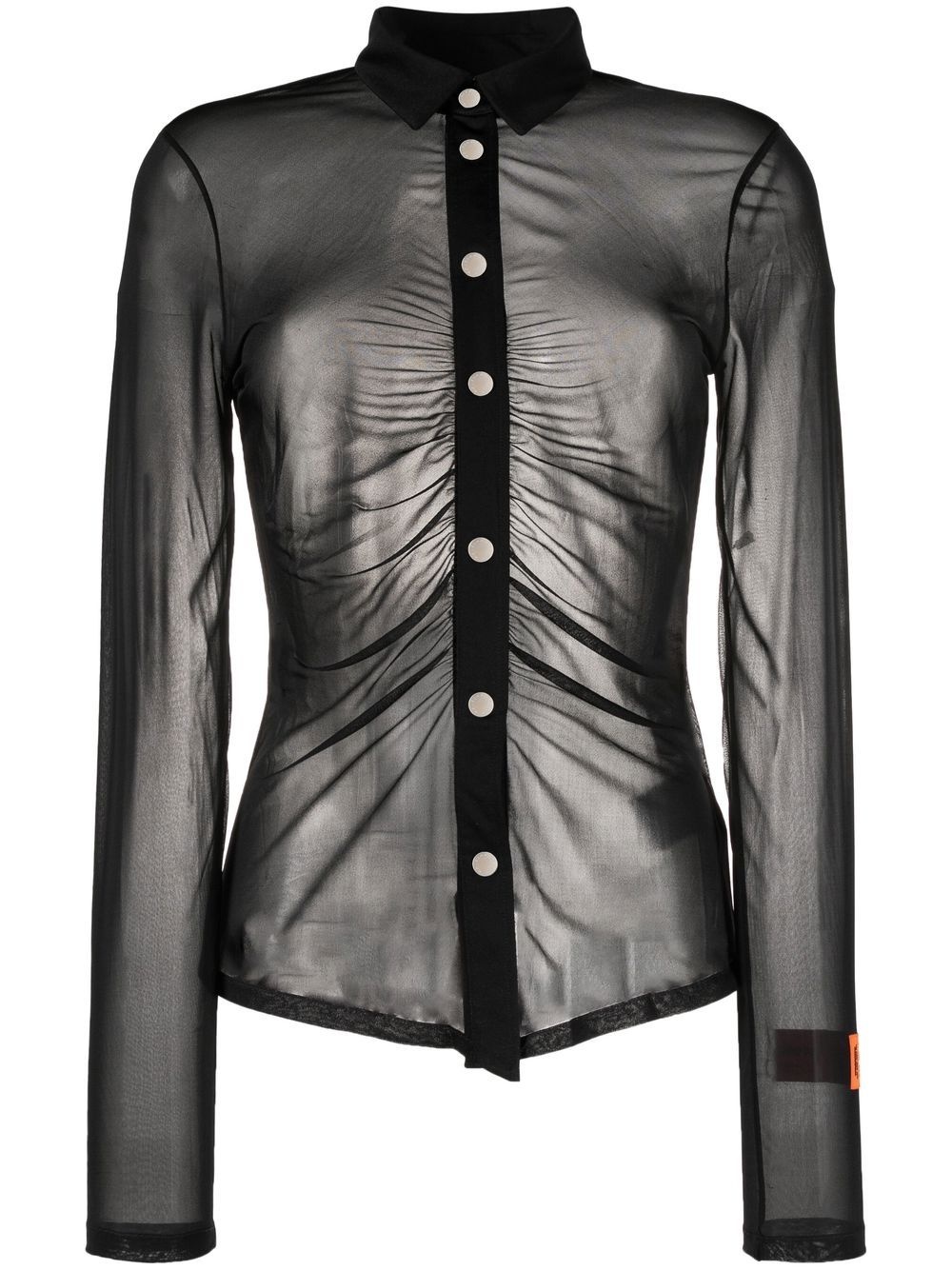 Georgette ruched long-sleeve shirt jet black logo patch at the sleeve ruched detailing classic collar front button fastening long sleeves Made in Italy Composition Outer: Viscose 77%, Polyester 23% Lining: Polyester 100% SIZE & FIT Model measurements Height 5 ft 10 in(1.78 m) Bust/Chest 31.49 in(80 cm) Hips 37 in(94 cm) Waist 23.62 in(60 cm) FittingInformation This piece fits true to size. We recommend you get your regular size Cut for a slim fit Made with a lightweight non-stretch fabric Washing instructions Dry Clean Only