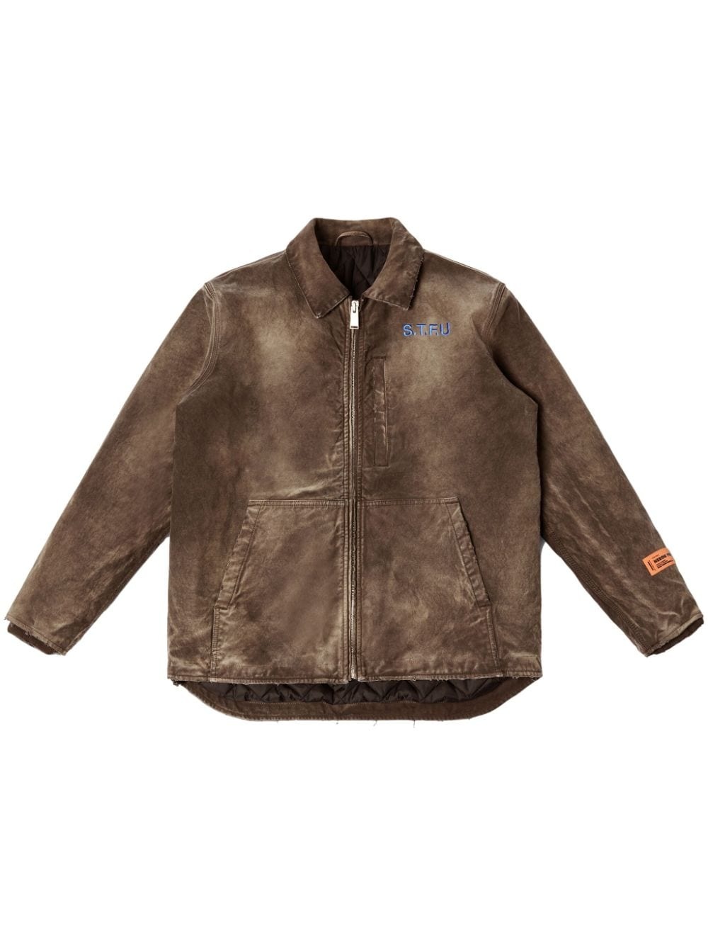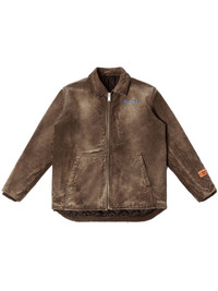 logo-patch cotton jacket Highlights - Chocolate brown - Cotton - Distressed effect - Logo patch at the sleeve - Embroidered slogan - Classic collar - Front zip fastening - Two front pouch pockets - Long sleeves - Straight hem Made in Italy Composition Outer: Cotton 100% Lining: Polyester 72%, Polyamide 23%, Polypropylene 5% SIZE & FIT FittingInformation Designed for an oversized fit, offering additional room throughout This piece fits true to size – take your usual size Washing instructions Read Manufacturer Guidelines