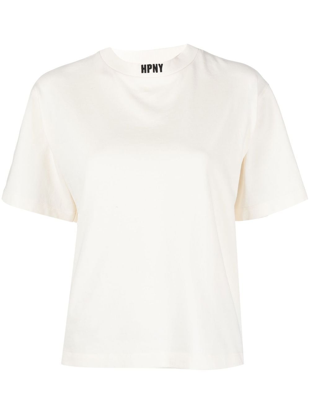 logo-print organic cotton T-shirt Heron Preston elevates the basic white T-shirt by printing its HPNY logo on the neckline of this cotton top. Highlights - White - Organic cotton - Crew neck - Logo print at the neckline - Short sleeves - Straight hem Imported Composition Cotton 100%, Polyester 100% SIZE & FIT Model measurements Height 5 ft 11 in(1.8 m) Bust/Chest 31.49 in(80 cm) Hips 35.82 in(91 cm) Waist 24.8 in(63 cm) FittingInformation This piece fits true to size. We recommend you get your regular size Cut for a loose fit Made with a mid-weight fabric Washing instructions Machine Wash