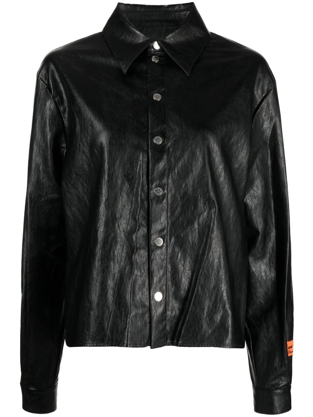 shimmer-finish long-sleeve shirt black shimmer finish classic collar front button fastening logo patch at the sleeve long sleeves buttoned cuffs rear curved hem Made in Italy Composition Polyurethane 63%, Viscose 21%, Polyester 5%, Other fibres 5%, Cotton 4%, Metal 2% SIZE & FIT Model measurements Height 5 ft 10 in(1.78 m) Bust/Chest 33.07 in(84 cm) Hips 33.85 in(86 cm) Waist 25.19 in(64 cm) Washing instructions Machine Wash