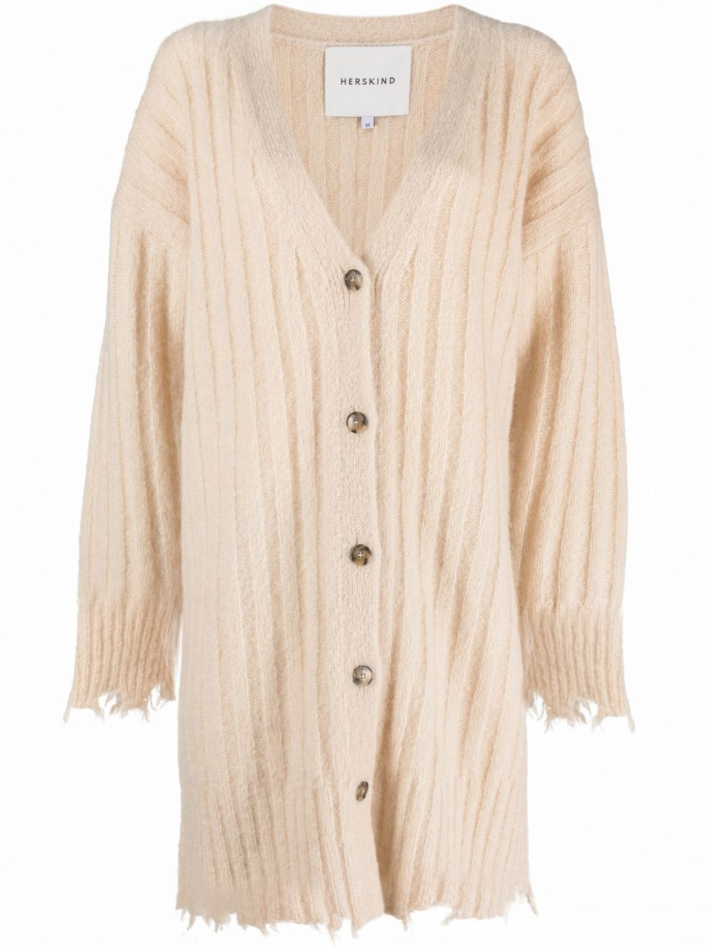 Base distressed ribbed cardi-coat Highlights - Beige - Ribbed knit - Distressed effect - V-neck - Front button fastening - Long sleeves - Straight hem Imported Composition Mohair 43%, Wool 42%, Polyamide 15% SIZE & FIT Model measurements Height 5 ft 11 in(1.8 m) Bust/Chest 33.07 in(84 cm) Hips 37.4 in(95 cm) Waist 25.19 in(64 cm) FittingInformation Designed for an oversized fit, offering additional room throughout Made with a midweight knit, this piece offers some stretch This piece fits true to size – take your usual size Washing instructions Hand Wash