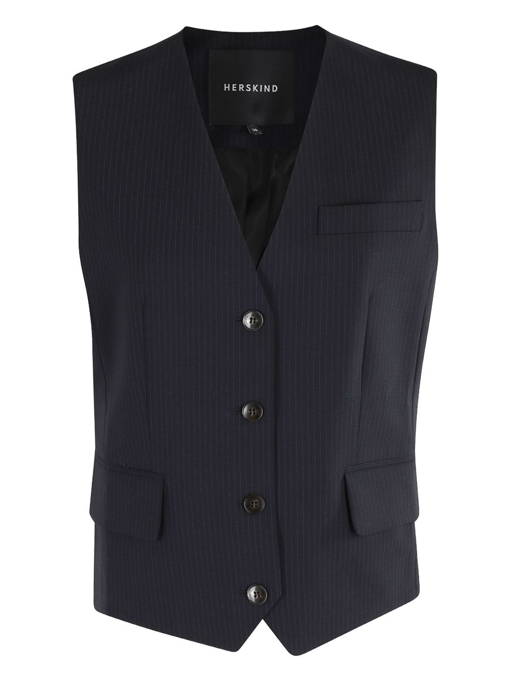 pinstripe sleeveless waistcoat Highlights - Navy blue - Pinstripe pattern - V-neck - Four-button fastening - Flap pockets - Sleeveless Imported Composition Polyester 53%, Virgin Wool 43%, Elastane 4% Washing instructions Read Manufacturer Guidelines