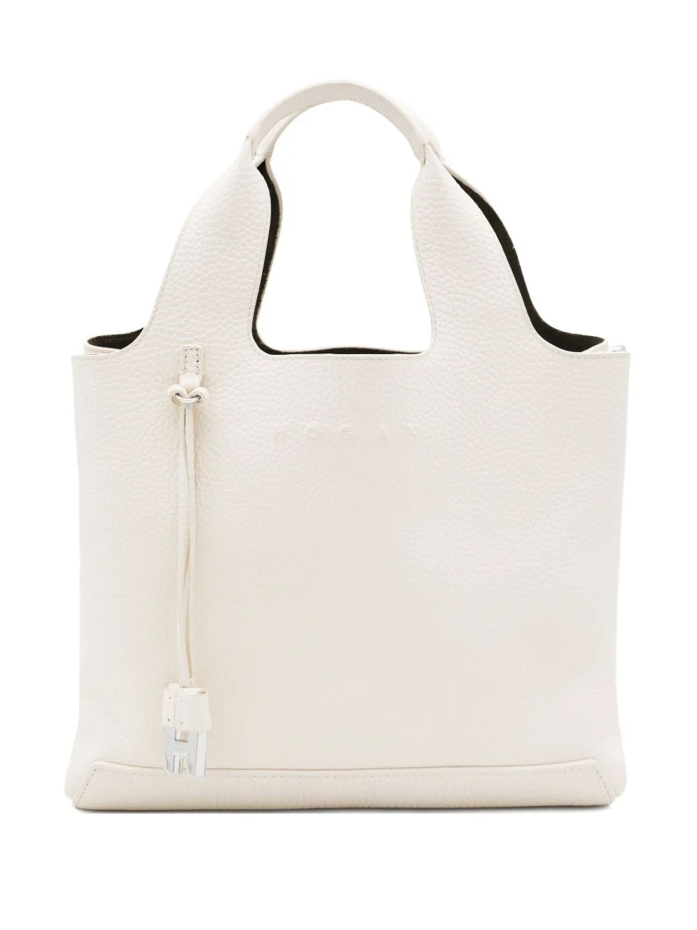 double top-handle leather tote bag Highlights - Off-white - Hammered leather - Two top-handles - Detachable and adjustable shoulder strap - Silver-tone hardware - Metal h-fob pendant Made in Italy Composition Leather 100% SIZE & FIT Measurement DEPTH 5.9 in(15 cm) HEIGHT 13.38 in(34 cm) WIDTH 8.85 in(22.5 cm)