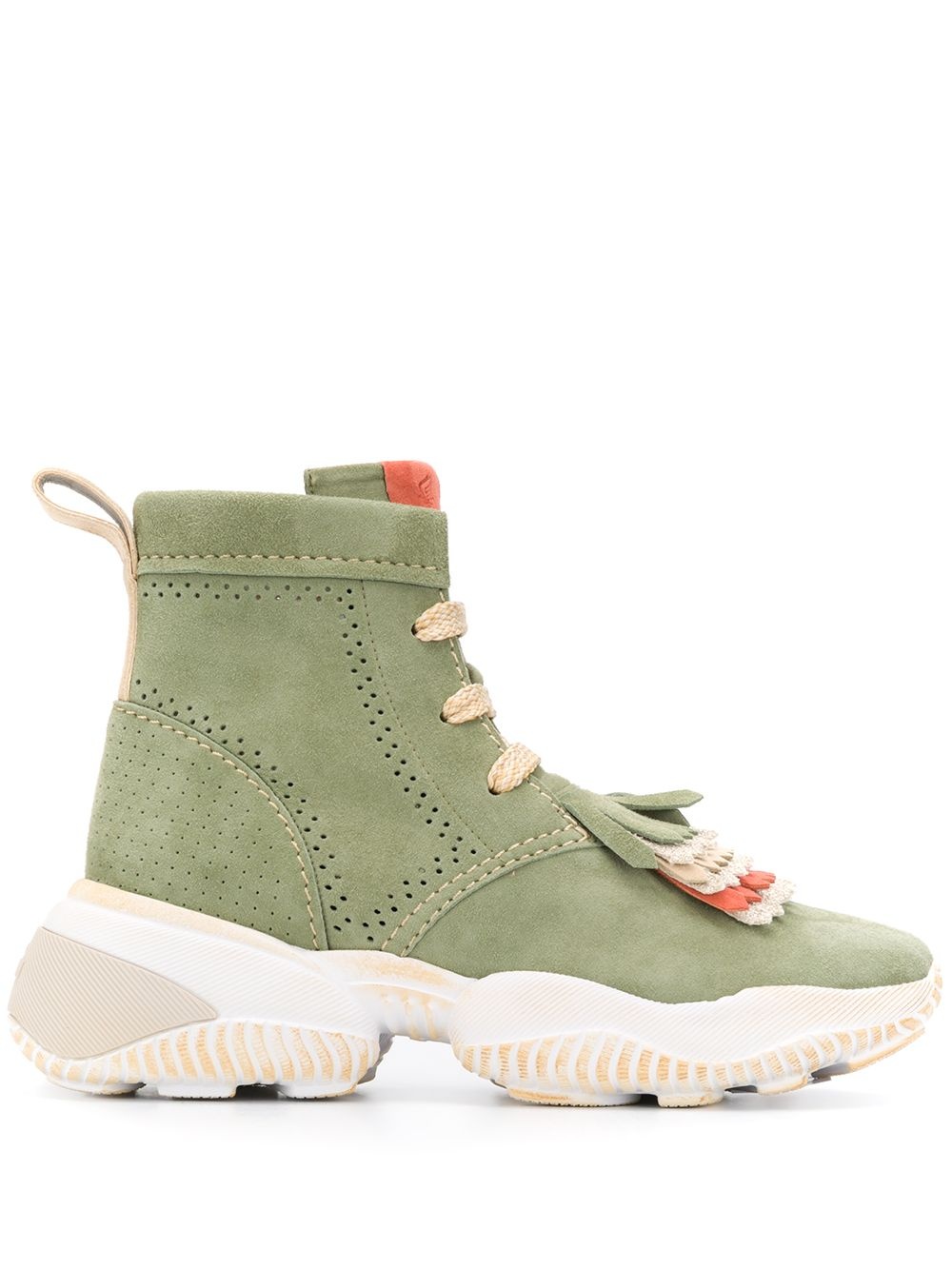 fringe-trimmed lace-up boots Sage green, orange and beige suede fringe-trimmed lace-up boots from Hogan featuring a round toe, fringe details, a pull tab at the rear, a lace-up front fastening and a chunky rubber sole. Made in Italy Composition Sole: Rubber 100% Outer: Calf Leather 100% Lining: Calf Leather 100% SIZE & FIT Measurement HEEL 2.36 in(6 cm) Sole height 1.18 in(3 cm) HEIGHT 4.52 in(11.5 cm)