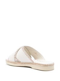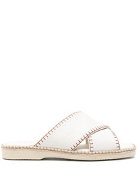 H660 leather sandals Highlights - Ivory white - Calf leather - Smooth grain - Square open toe - Whipstitch trim - Crossover strap detail - Branded footbed - Flat rubber sole - Slip-on style Made in Italy Composition Leather 100% SIZE & FIT Measurement HEEL 0.78 in(2 cm) Sole height 0.59 in(1.5 cm)