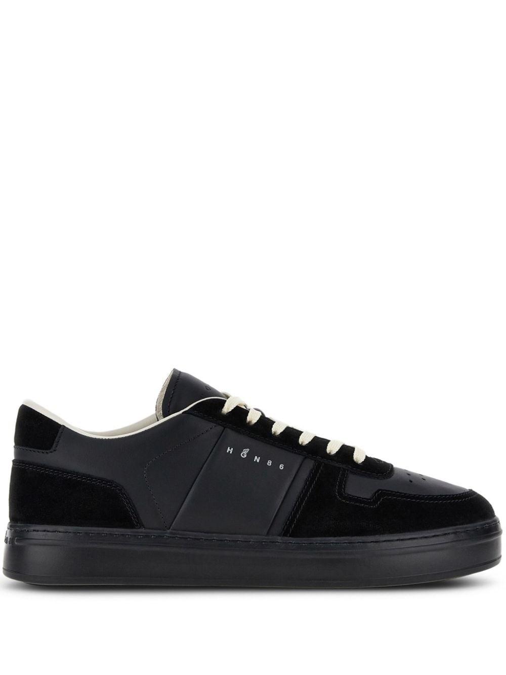 H668 low-top sneakers Highlights - Black/off-white - Calf leather - Tonal stitching - Signature logo on the side - Front lace-up fastening - Round toe - Branded insole - Ridged rubber sole Made in Italy Composition Outer: Calf Suede 100%, Calf Leather 100% Lining: Calf Leather 100% Sole: Rubber 100%