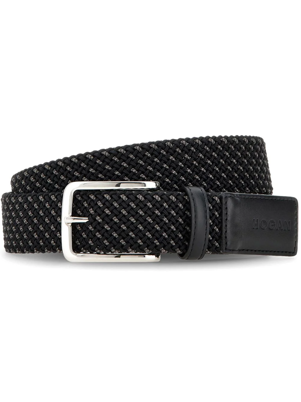 leather-trim belt Highlights - Black - Pin-buckle fastening - Debossed logo to the front - Silver-tone hardware - Interwoven design Made in Italy Composition Viscose 80%, Rubber 10%, Calf Leather 10%