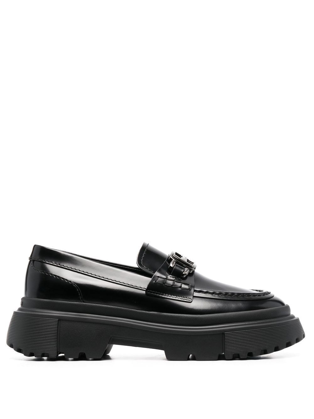 logo buckle platform loafers Hogan takes the classic silhouette of a penny loafer and brings a spin on it with their AW22 iteration. This pair of black footwear is designed with a chunky platform ridged rubber sole and branded clearly with a logo buckle. Made in Italy Composition Leather 100% SIZE & FIT Measurement HEEL 1.37 in(3.5 cm) Sole height 1.18 in(3 cm)