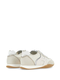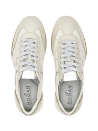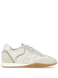 Olympia-Z nubuck leather sneakers Crafted in nubuck leather, Hogan's sneakers are an iconic style for the brand. Distinguishable by the ridged rubber sole and panelled design the pair is complete with the wavy 'H' initial adorned at the side. Highlights - White - Nubuck leather - Contrasting panel detail - Contrast stitching - Contrasting heel counter - Round toe - Front lace-up fastening - Branded insole - Rubber sole Made in Italy Composition Leather 100%
