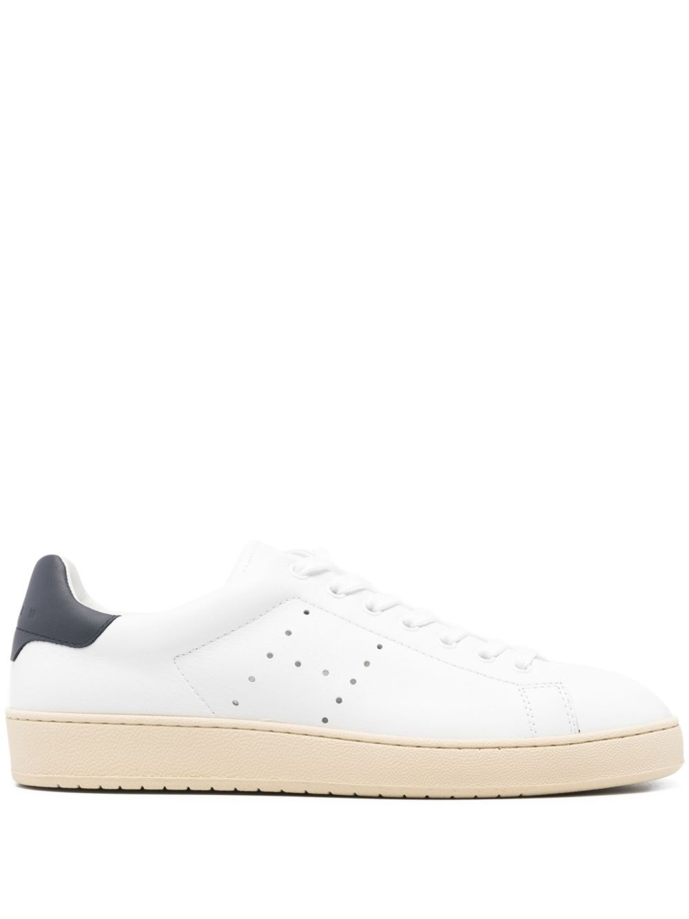 perforated leather sneakers Highlights - White - Leather upper - Perforated detailing - Contrasting heel panel - Lace-up fastening Imported Composition Lining: Calf Leather 100% Sole: Rubber 100% Outer: Calf Leather 100%