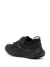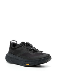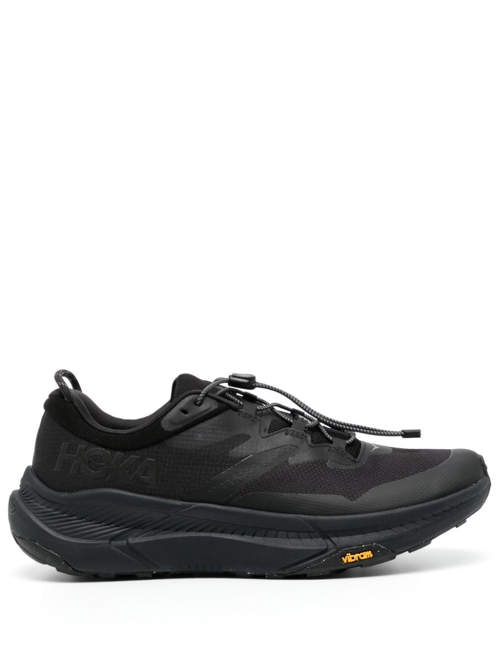 Transport hiking sneakers Blending urban style with performance-enhancing features, the Transport hiking sneakers exemplify HOKA's prowess in footwear design. Crafted with an abrasion-resistant Cordura® upper, they feature a convenient quick-lace fastening and Vibram Mega-Grip treads, offering added cushioning and support on even the most challenging terrain. Highlights - Black - Panelled design - Logo print to the side - Drawstring fastening - Round toe - Pull-tab at the heel - Rubber sole - Vibram® sole Imported Composition Outer: Fabric 50%, Plastic 50% Lining: Fabric 100% Sole: Plastic 100% SIZE & FIT Measurement HEEL 1.96 in(5 cm) HEIGHT 2.16 in(5.5 cm) Sole height 1.18 in(3 cm)