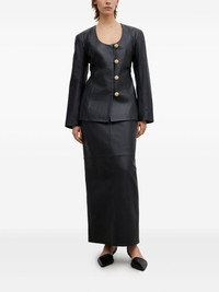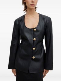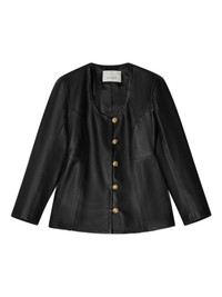 scoop-neck leather jacket Highlights - Black - Five button front - Long sleeves - Fitted seams - Gold-tone buttons - Shaped hem Imported Composition Calf Leather 100%