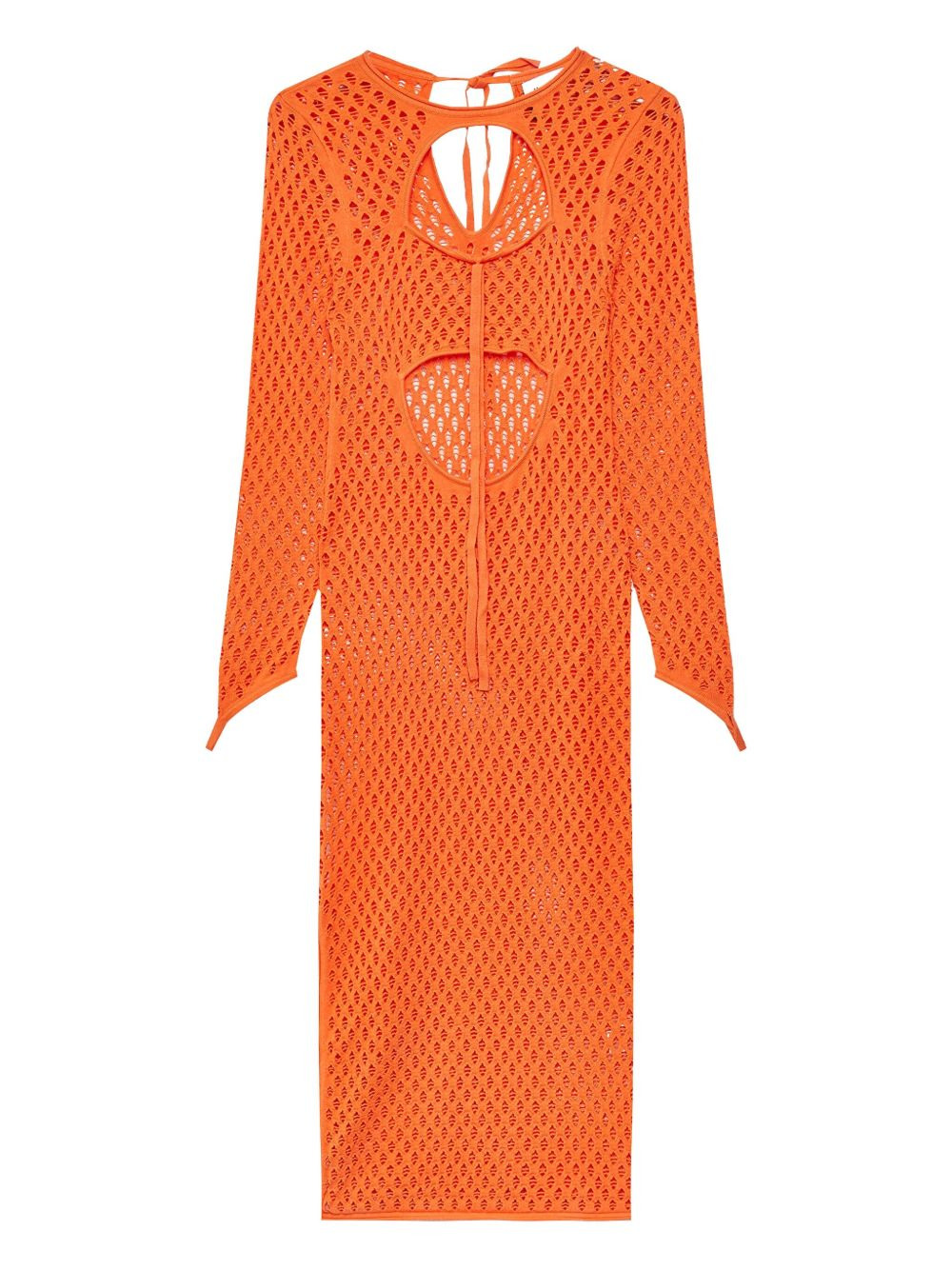 cutout knit dress Highlights - Orange - Open knit - Cut-outs - Tie fastening - Midi length - Long sleeves Imported Composition Cotton 100% Washing instructions Read Manufacturer Guidelines