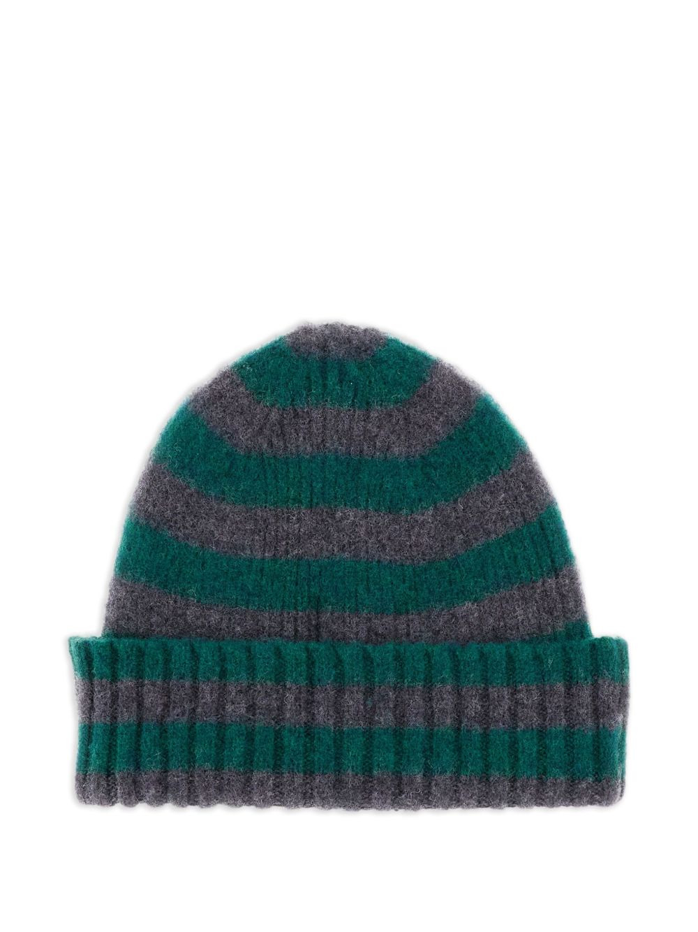 Hard Working striped-pattern beanie hat Highlights - Grey and green - Striped pattern - Ribbed trim Made in United Kingdom Composition Lambs Wool 100%
