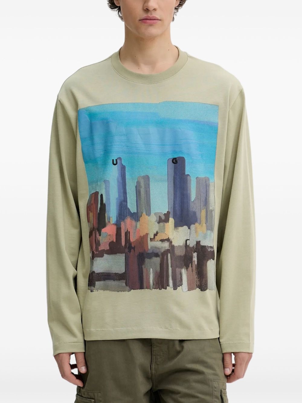 cityscape-print long-sleeve T-shirt Highlights - Light green - Long sleeves - Crew neck - Cityscape print - Paint effect Imported Composition Cotton 100% Washing instructions Read Manufacturer Guidelines