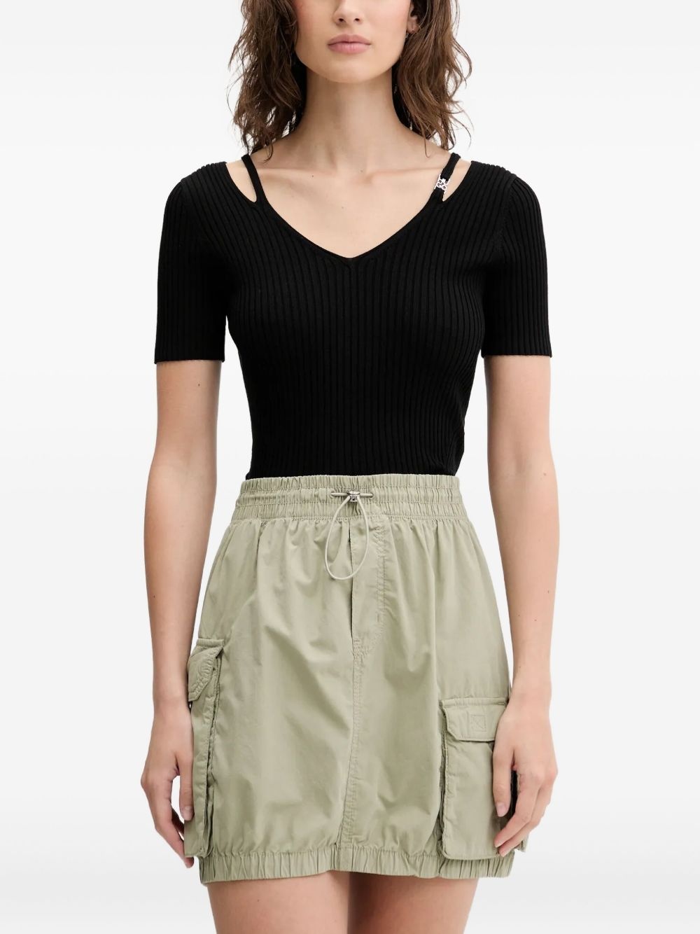 cut-out ribbed top Highlights - Black - Short sleeves - Straight hem Imported Composition Viscose 76%, Polyamide 24% Washing instructions Read Manufacturer Guidelines