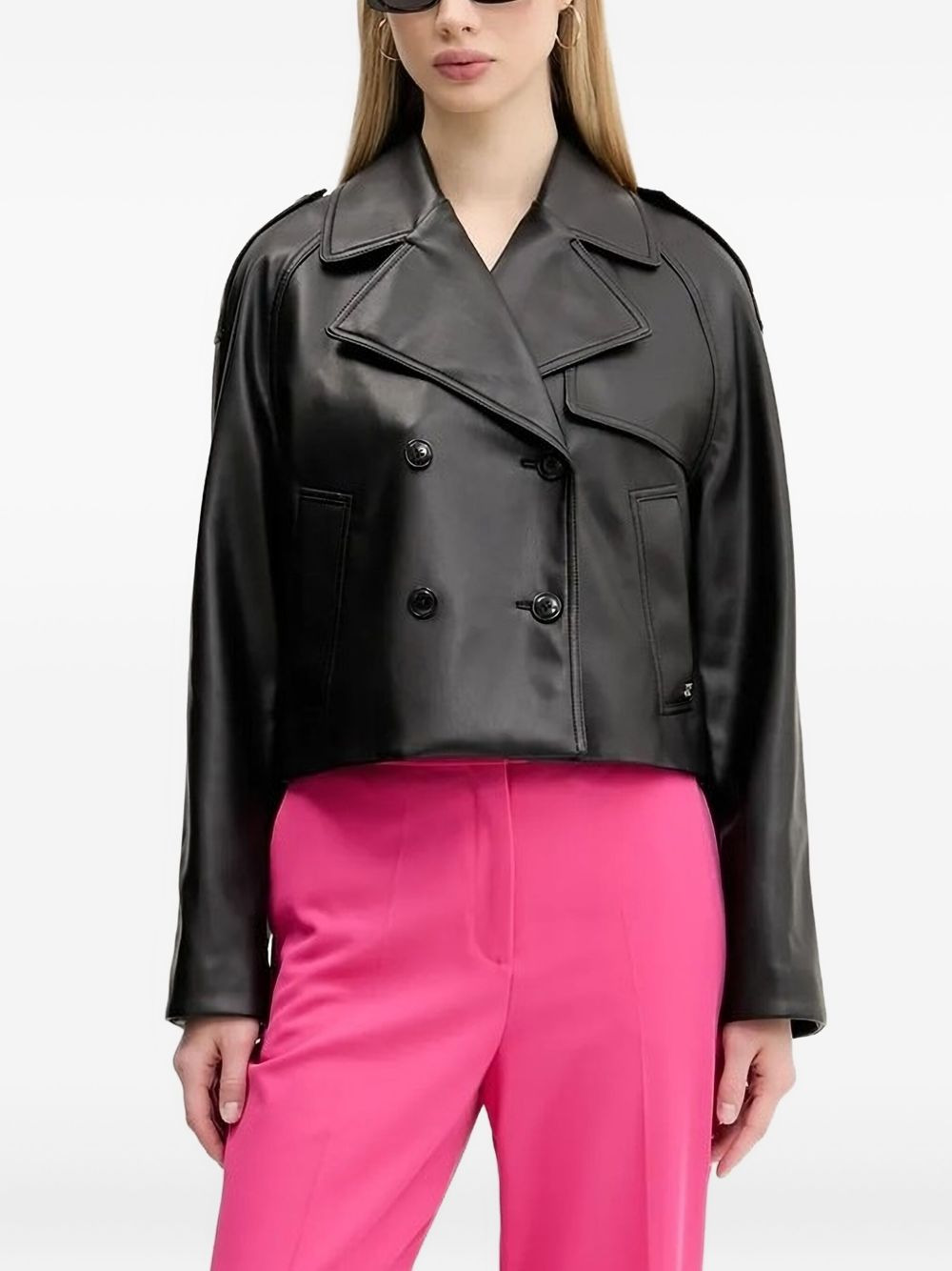 double-breasted cropped jacket Highlights - Black - Faux leather - Double-breasted - Button closure - Cropped length - Epaulettes - Welt pockets Imported Composition Outer: Polyester 100% Lining: Polyester 100% Washing instructions Read Manufacturer Guidelines