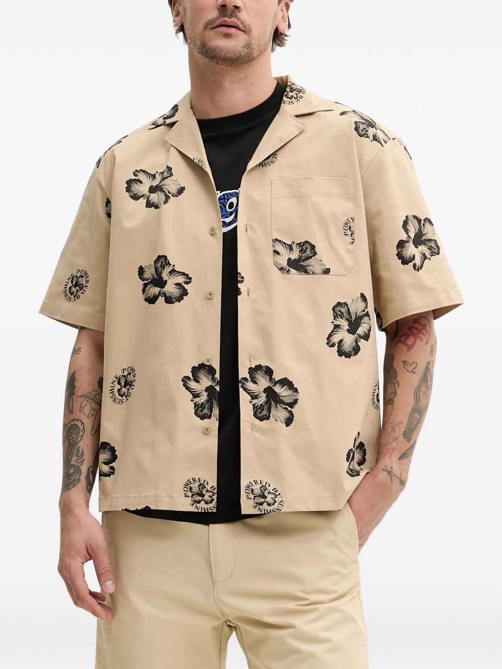 floral-print camp-collar shirt Highlights - Beige - All-over floral print - Camp collar - Short sleeves - Front button fastening - Chest patch pocket Imported Composition Cotton 98%, Spandex/Elastane 2% Washing instructions Machine Wash