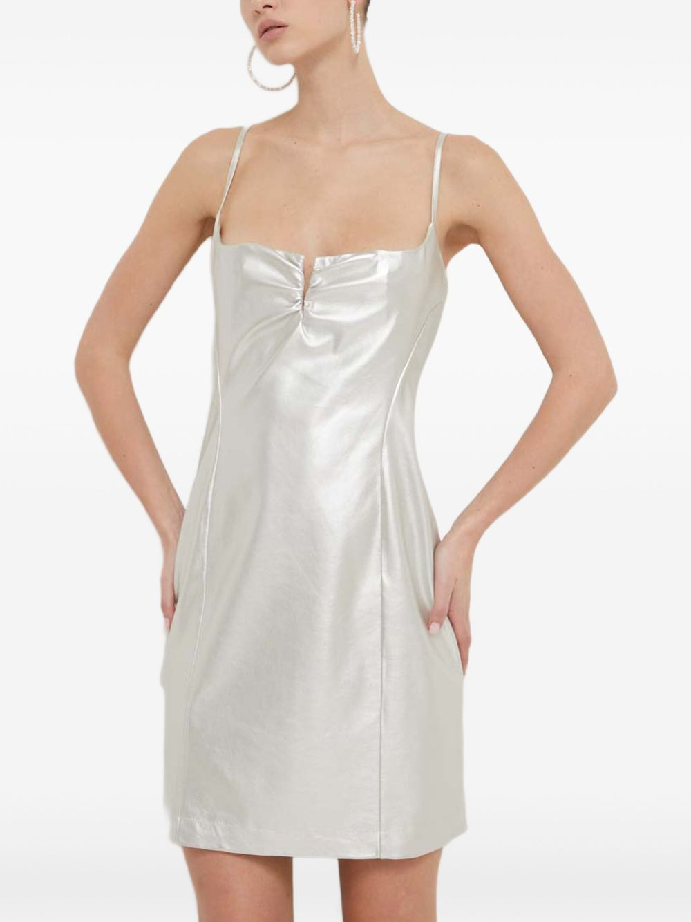 METALLIC FAUX-LEATHER MINI DRESS WITH NOTCH NECKLINE