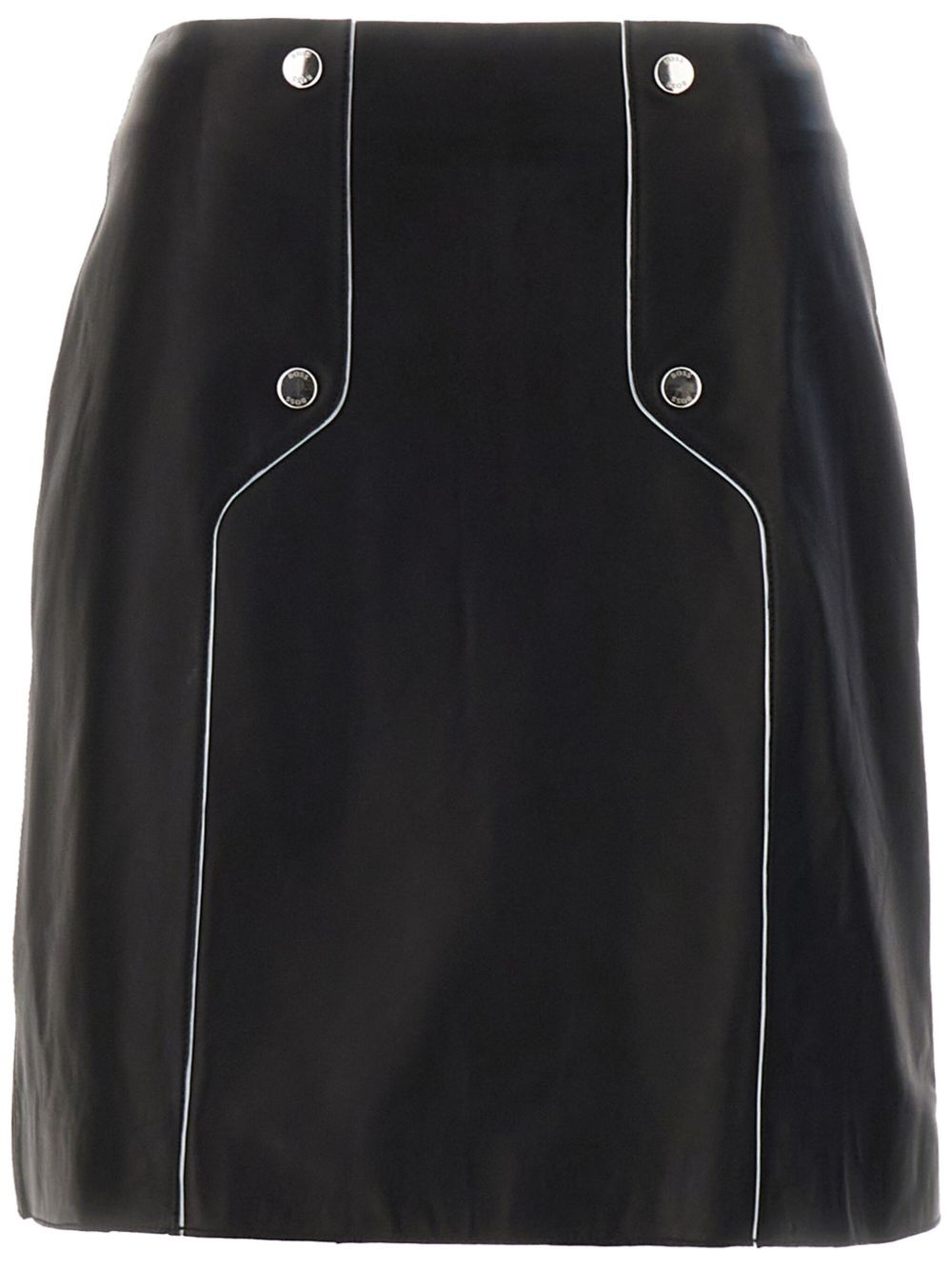 leather mini skirt Highlights - Black - Lambskin - Panelled design - Rear zip fastening - High-waisted - Piped-trim detailing - Logo print to the side - Stud detailing - A-line - Straight hem - Above-knee length Made in Italy Composition Lining: Polyester 100% Outer: Lambskin 100%