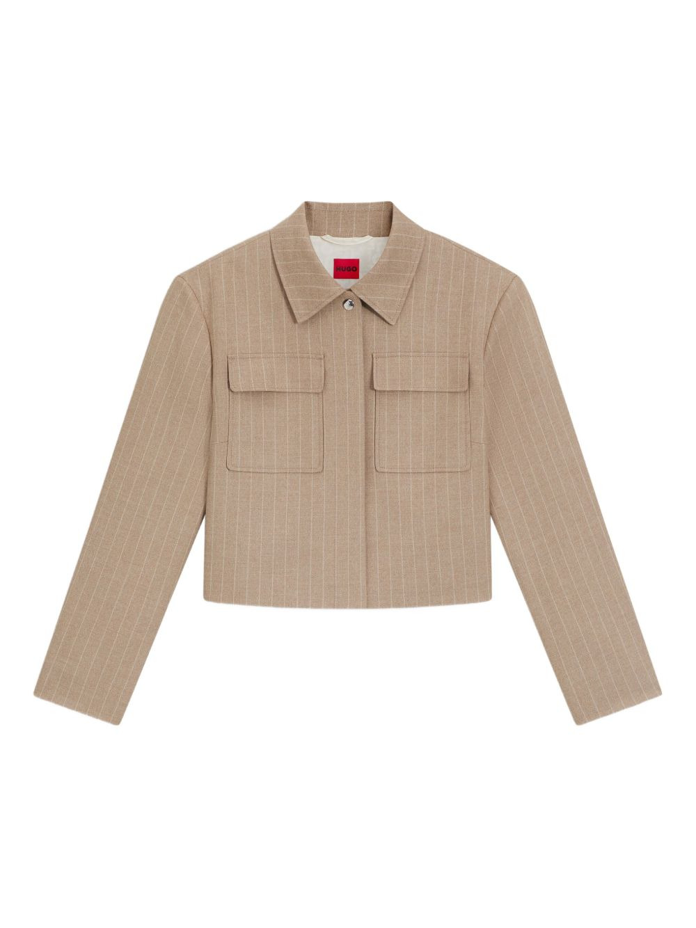 pinstriped cropped jacket Highlights - Beige - Press-stud fastening - Chest flap pockets - Long sleeves - Textured finish Imported Composition Polyester 64%, Viscose 34%, Fabric 2% Washing instructions Read Manufacturer Guidelines