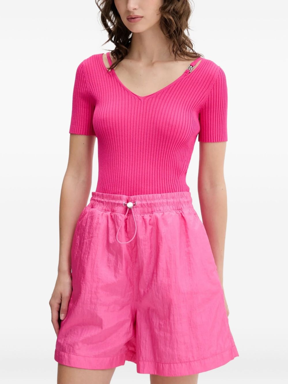 ribbed V-neck top Highlights - Hot pink - V-neck - Short sleeves - Ribbed texture - Metal logo strap detailing Imported Composition Viscose 76%, Polyamide 24% Washing instructions Machine Wash