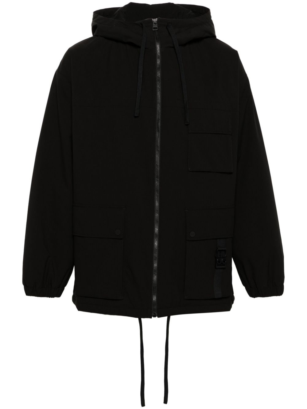ripstop hooded cargo jacket Highlights - Black - Water-repellent - Ripstop texture - Tonal design - Stacked-logo buckle detail - Drawstring hood - High neck - Front zip fastening - Drop shoulder - Long sleeves - Elasticated cuffs - Multiple cargo pockets - Full lining - Locker loop - Internal zip-fastening pocket - Drawstring hem Imported Composition Outer: Polyester 100%, Polyurethane 100% Lining: Polyester 65%, Cotton 35% SIZE & FIT Model measurements Height 6 ft 2 in(1.87 m) Bust/Chest 36.22 in(92 cm) Hips 37 in(94 cm) Waist 27.95 in(71 cm) FittingInformation Designed for a boxy fit, intended for a loose fit throughout The internal drawstring at the hem allows for fitted preferences Made from a midweight non-stretch fabric This piece fits true to size – take your usual size Washing instructions Machine Wash