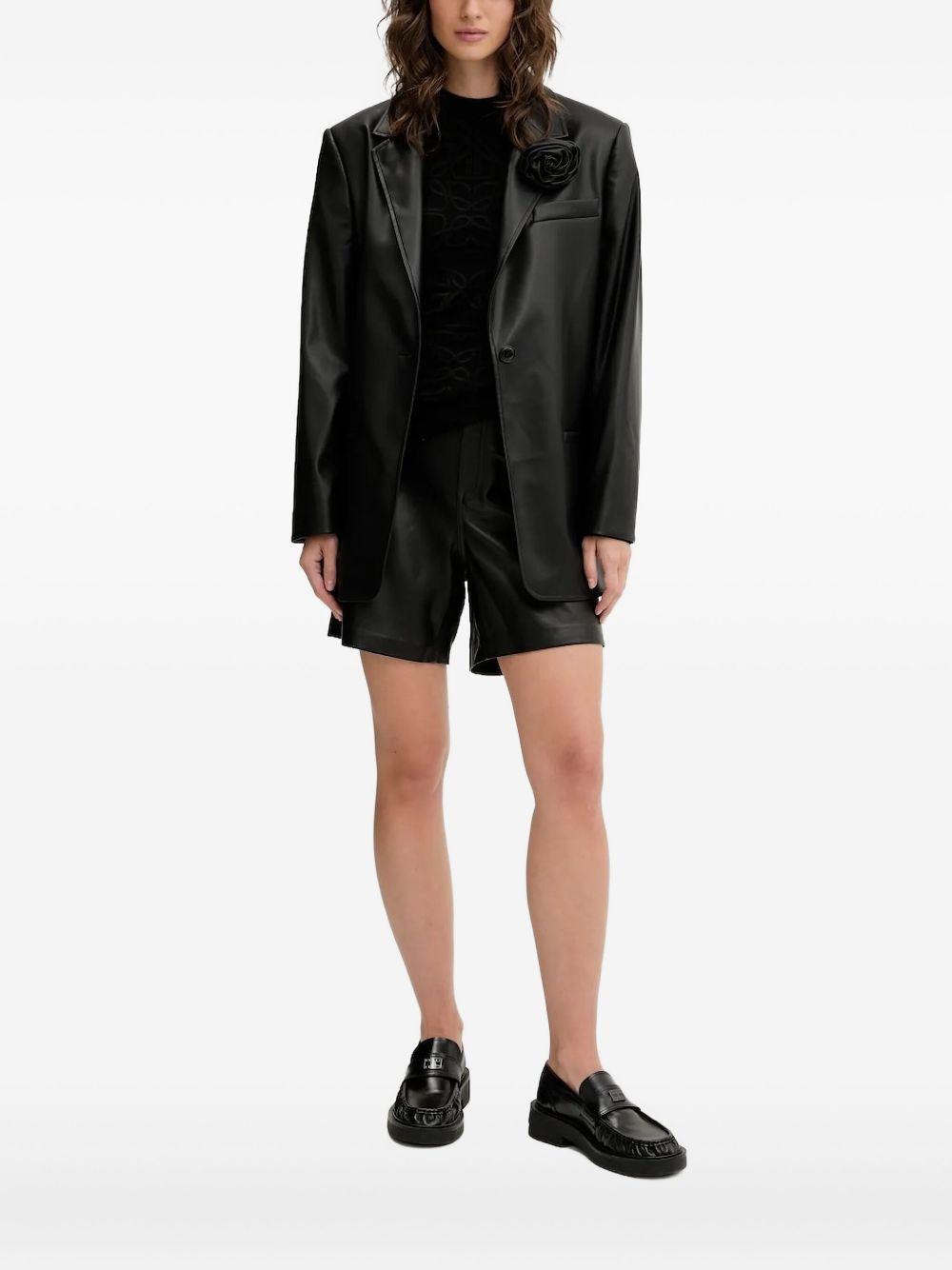rose-embellished blazer Highlights - Black - Rose embellishment - Single button fastening - Notched lapel - Welt pockets Imported Composition Polyurethane 100%, Polyester 100% Washing instructions Read Manufacturer Guidelines