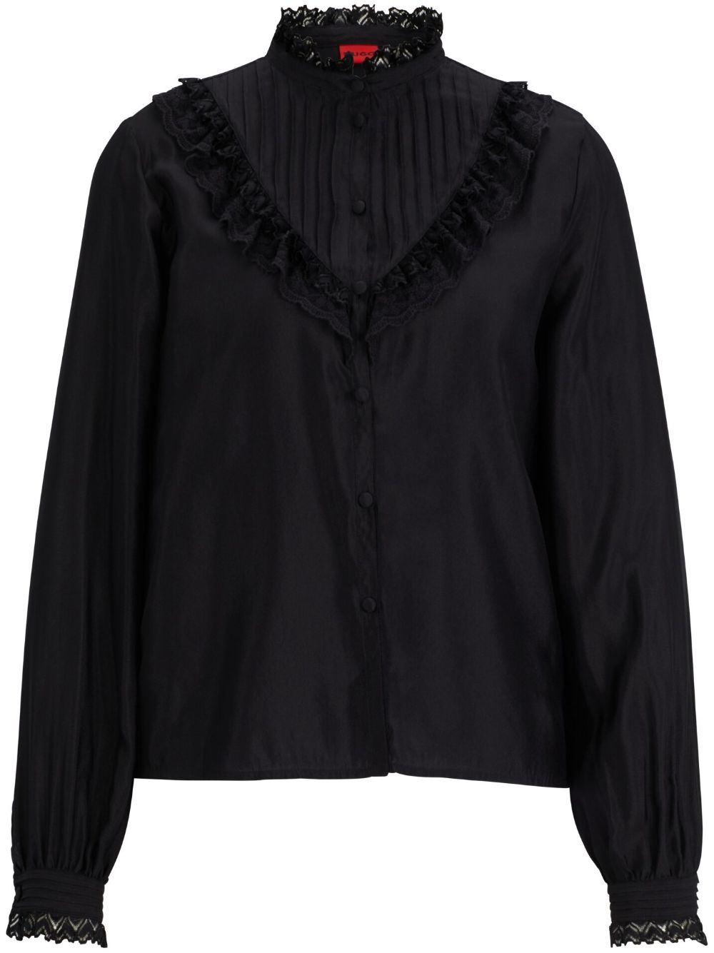 ruffled-trim blouse Highlights - Black - Ruffled trim - Pleat detailing - Stand-up collar - Long sleeves - Curved hem - Front button fastening Imported Composition Viscose 86%, Polyester 14%