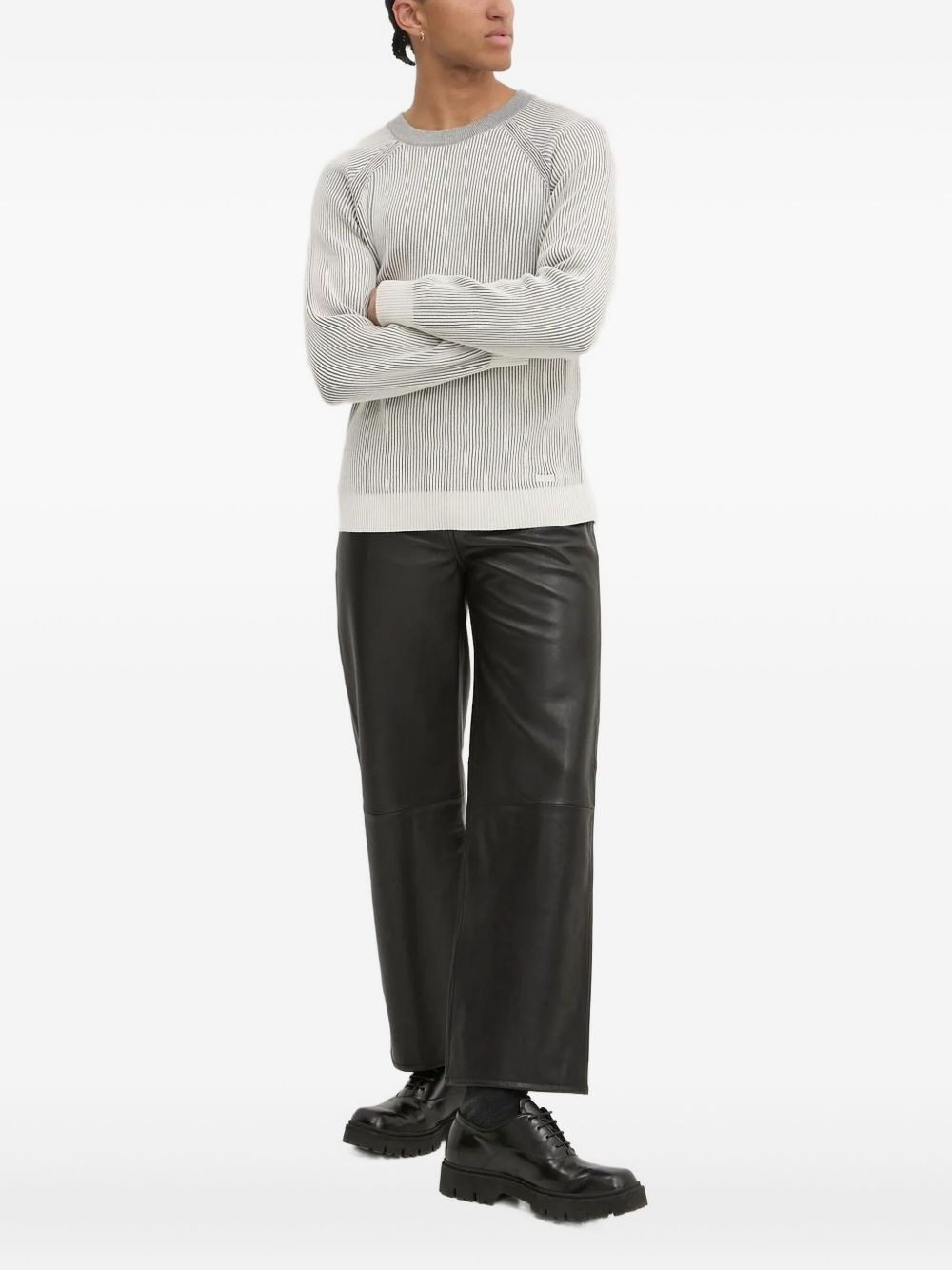 striped sweater Highlights - Light grey - Organic cotton - Ribbed texture - Round neck - Long sleeves - Striped detail Imported Composition Organic Cotton 100% Washing instructions Machine Wash