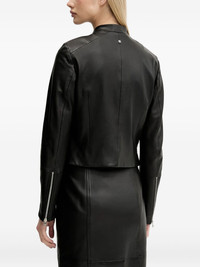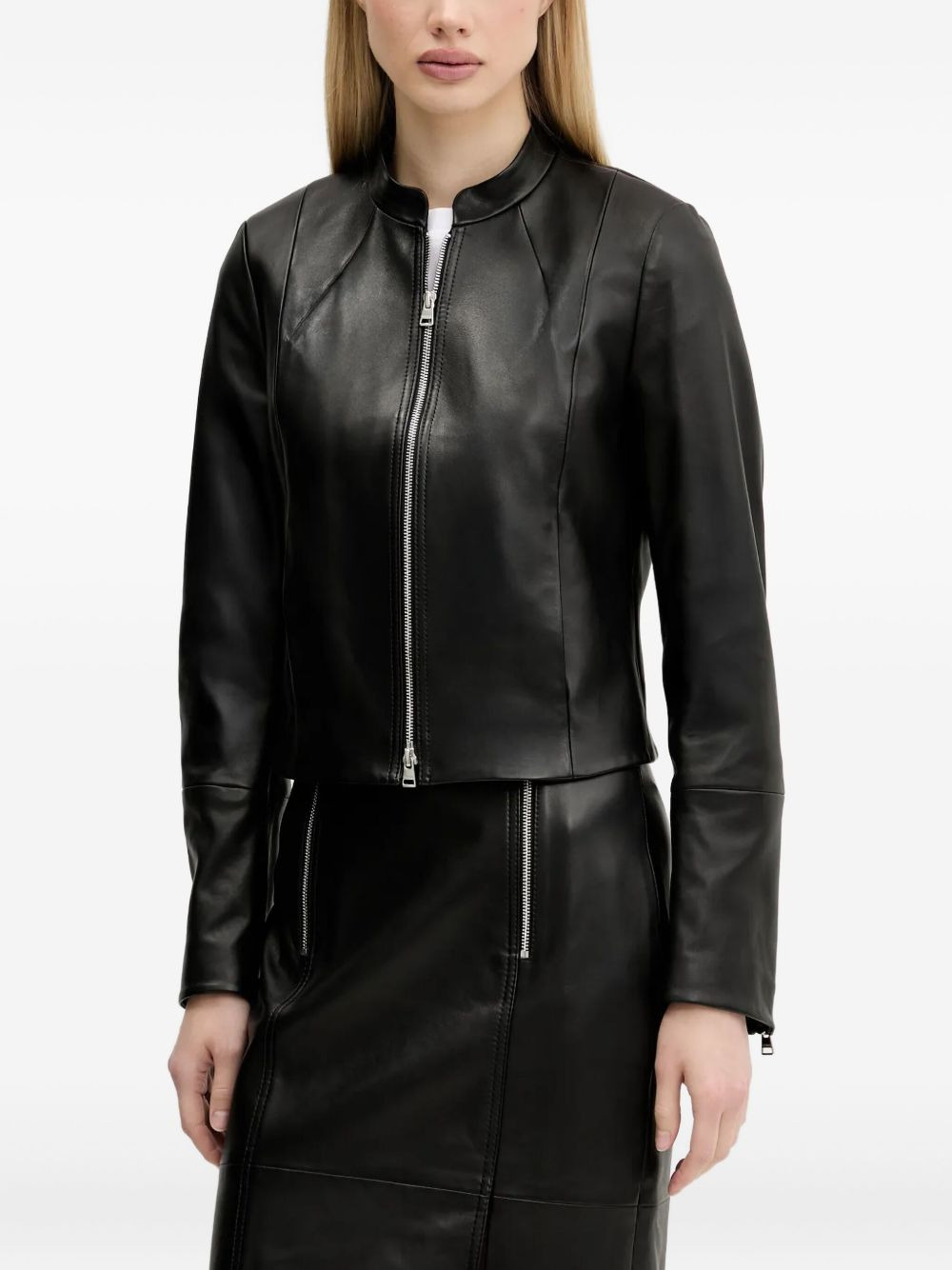zip-front panelled leather jacket Highlights - Black - Zip front fastening - Panelled design - Long sleeves - Zip cuffs - Stand collar Imported Composition Polyester 100%, Calf Leather 100%, Recycled Polyester 100%