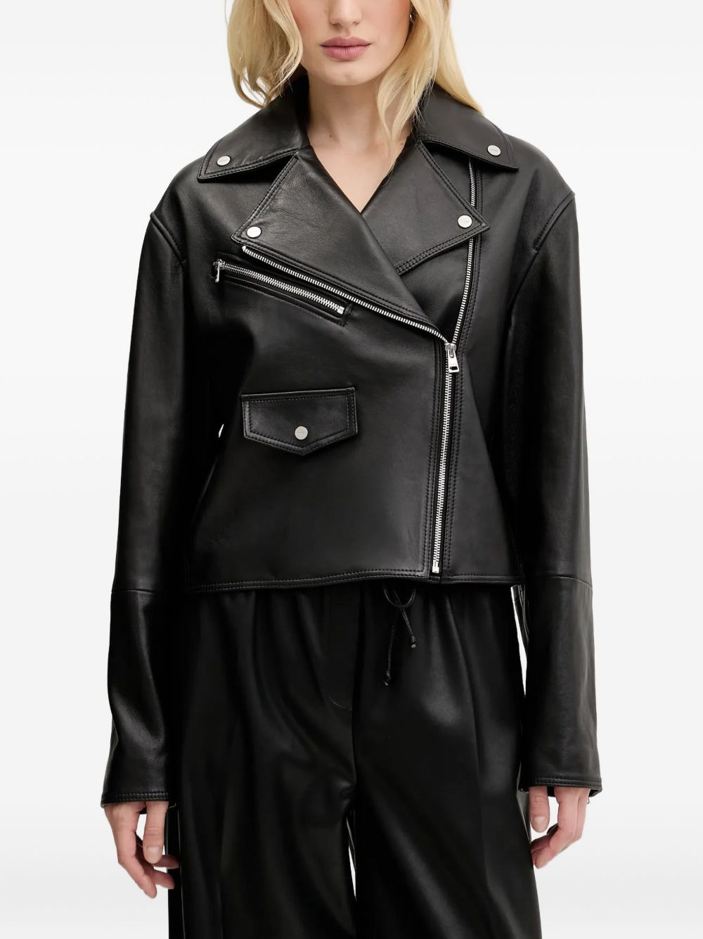 zipped leather biker jacket Highlights - Black - Lamb-skin leather - Diagonal zip-fastening - Zip pockets - Silver-tone hardware - Long sleeves Imported Composition Outer: Lamb Skin 100% Lining: Recycled Polyester 100% Washing instructions Read Manufacturer Guidelines