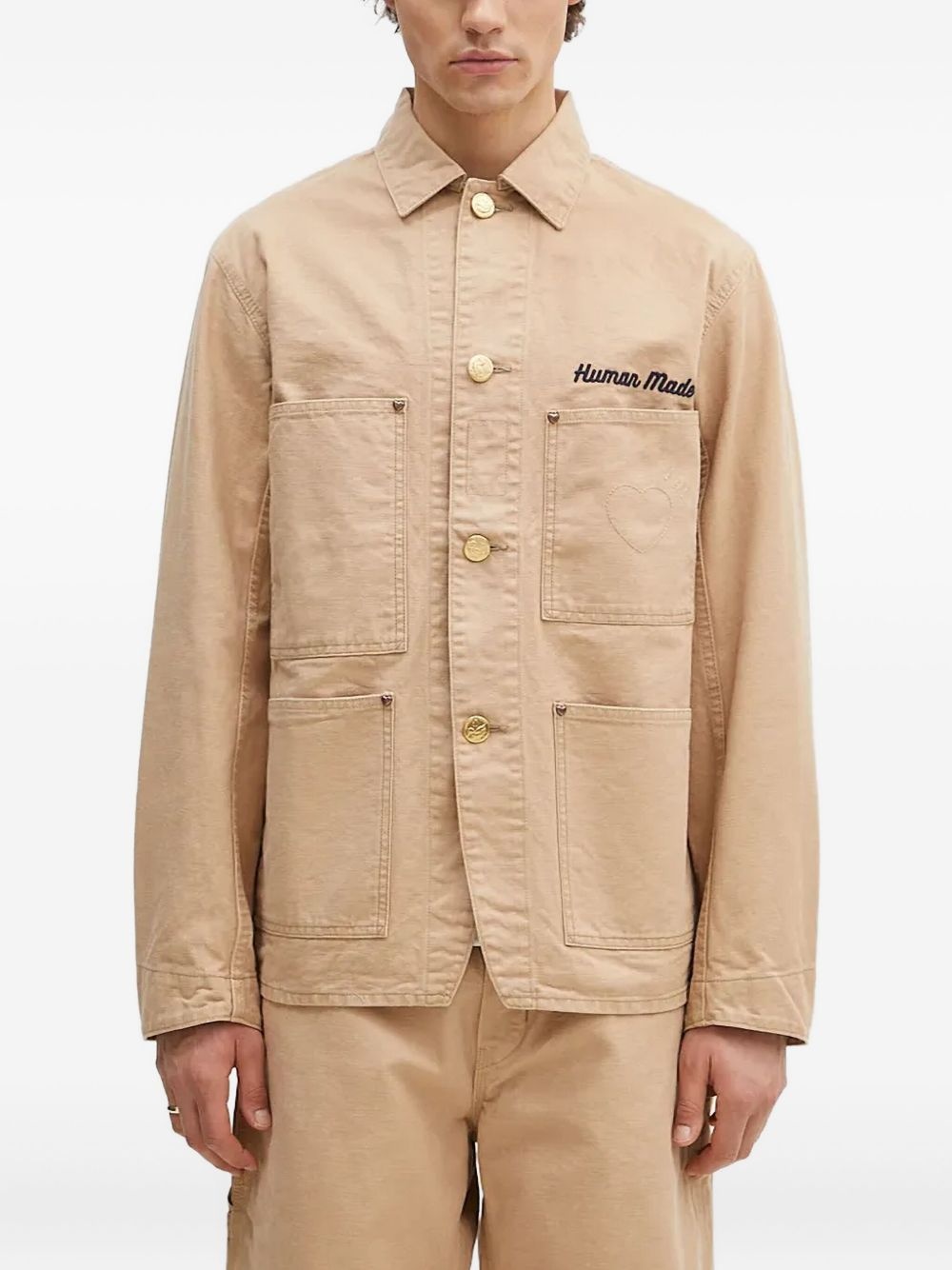 embroidered-logo shirt jacket Highlights - Beige - Embroidered logo to the rear - Multiple pockets - Button fastening - Long sleeves Imported Composition Cotton 100% Washing instructions Read Manufacturer Guidelines