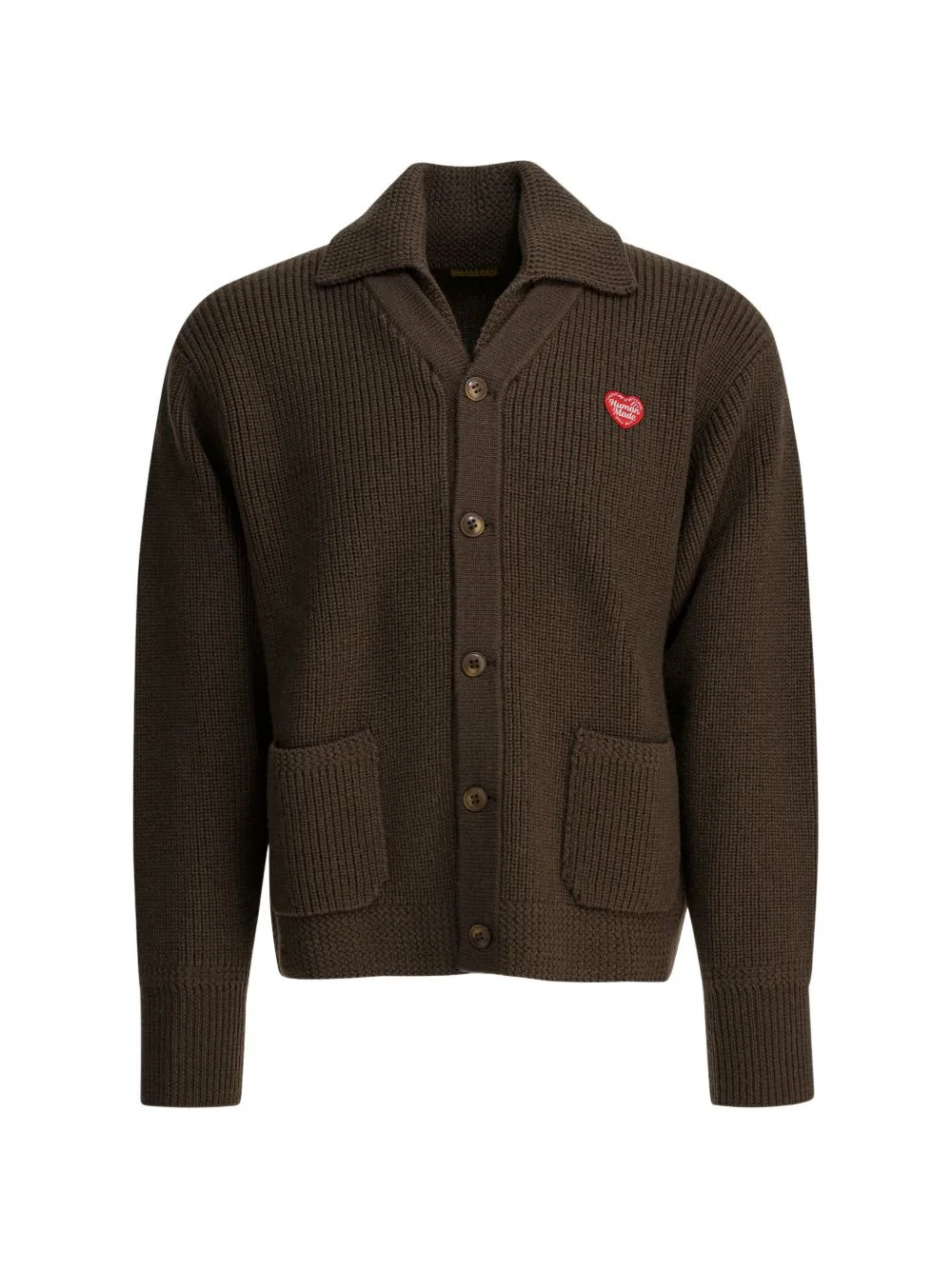spread-collar button-up cardigan Highlights - Brown - Ribbed knit - Front button fastening - Two front pockets - Spread collar - Heart motif Imported Composition Wool 100% Washing instructions Read Manufacturer Guidelines