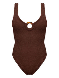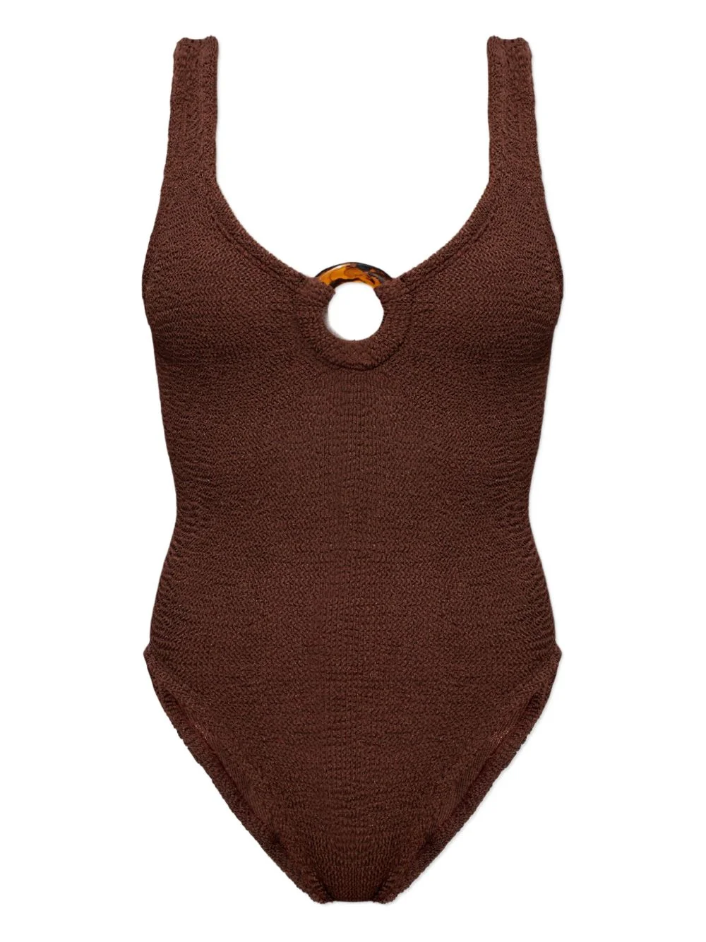 Celine ring crinkle swimsuit Highlights - Brown - Crinkle texture - Ring detail - Scoop neck - Sleeveless - Scoop back - Be mindful to try on swimwear over your own garments. Imported Composition Polyamide 97%, Elastane 3% Washing instructions Read Manufacturer Guidelines
