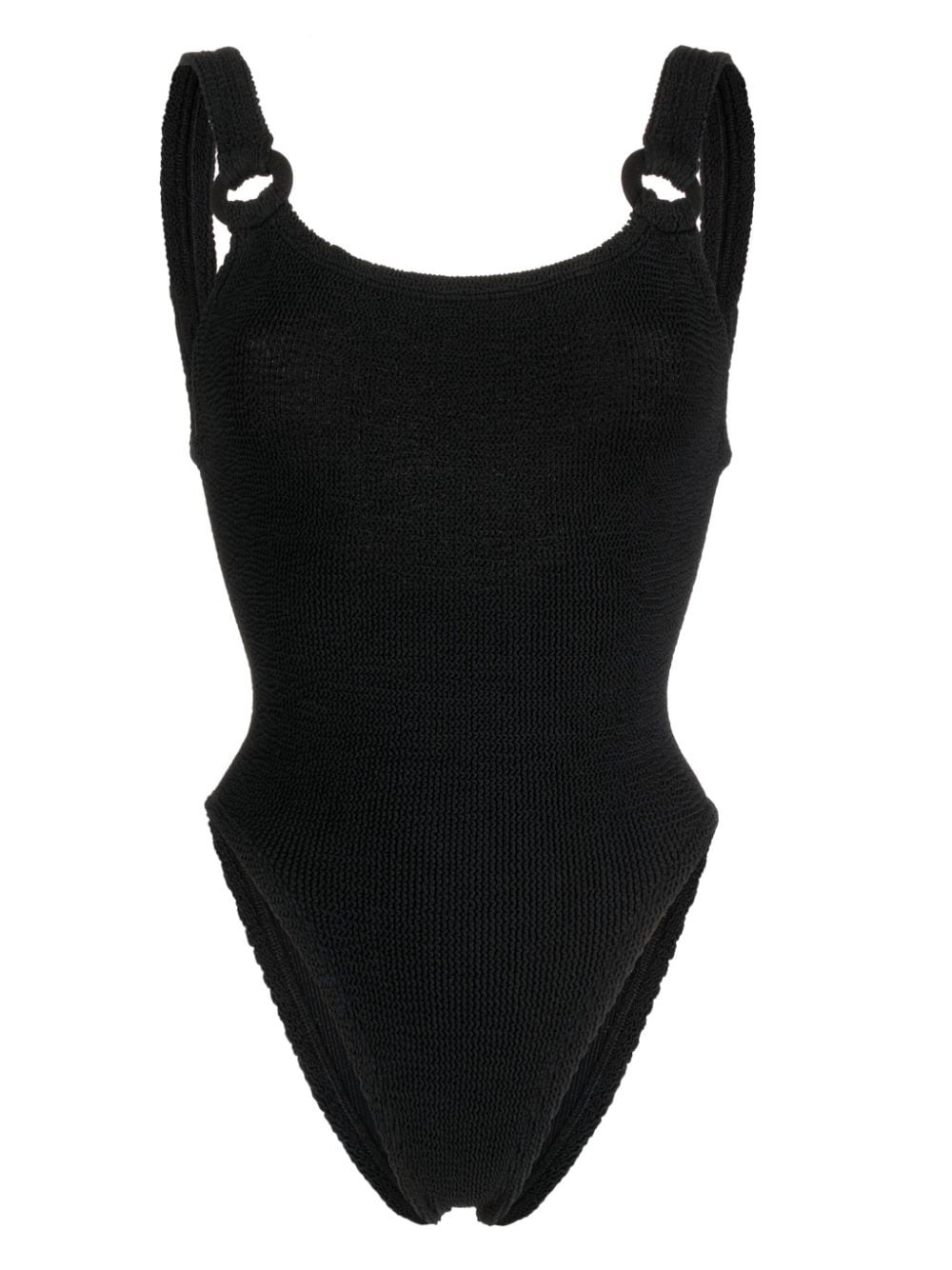 Domino swimsuit Sustainable swimwear brand Hunza G's unique crinkle-stretch fabrication is knitted and dyed locally to minimise the brand's carbon emissions and wastage. Inspired by 1980s styles, this Domino swimsuit has a scoop neckline and low back. Highlights - Black - Stretch-design - Towelling finish - Chunky hoop design - Scoop neck - Thick shoulder straps - Open back - Finished edge - Be mindful to try on swimwear over your own garments. Imported Composition Polyamide 97%, Elastane 3% SIZE & FIT Measurement BUST 21.25 in(54 cm) HIPS 15.74 in(40 cm) WAIST 17.32 in(44 cm)