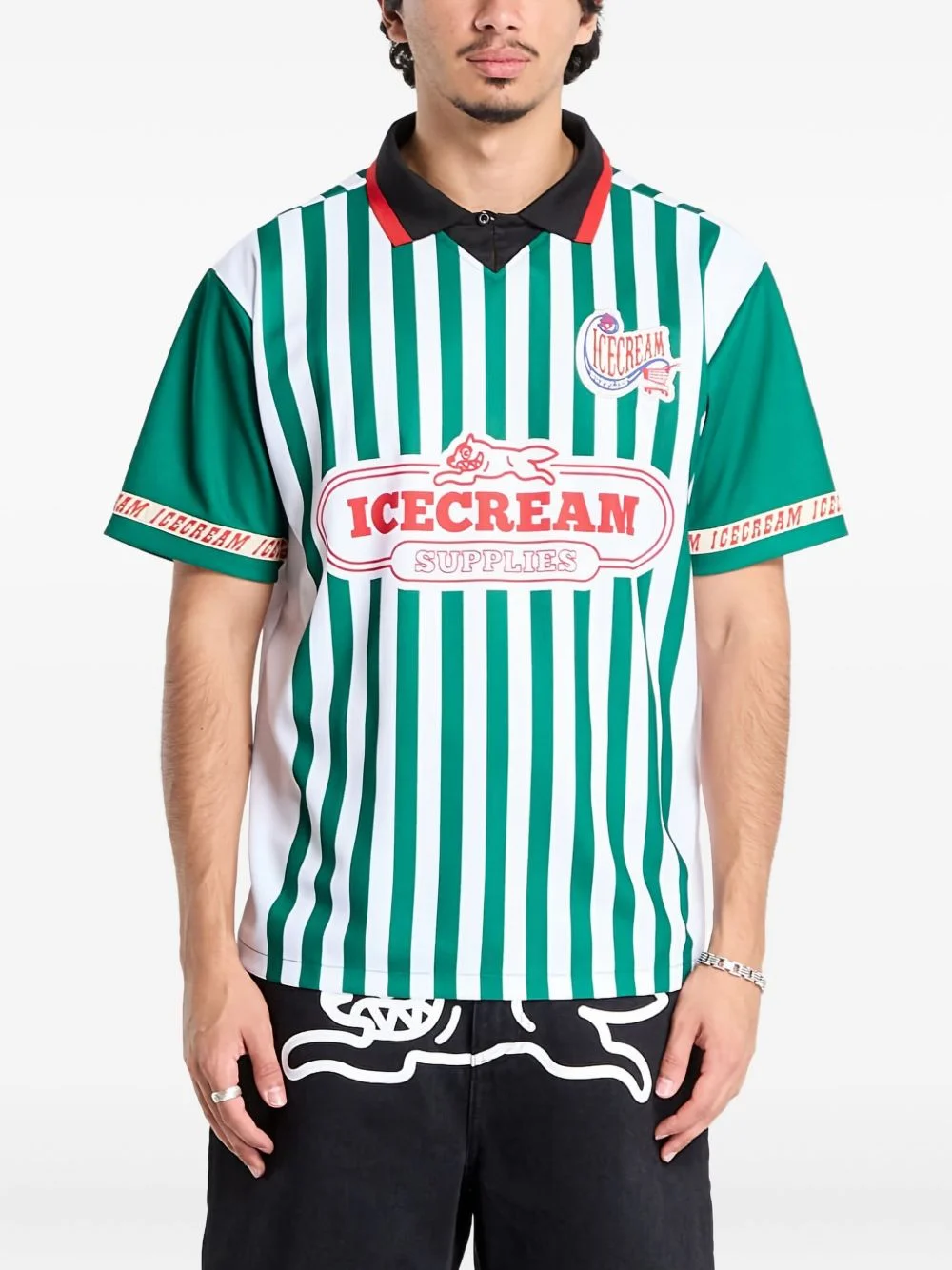 striped football polo shirt Highlights - Green - Striped - Short sleeves - Polo collar - Logo detail Imported Composition Polyester 100% Washing instructions Read Manufacturer Guidelines