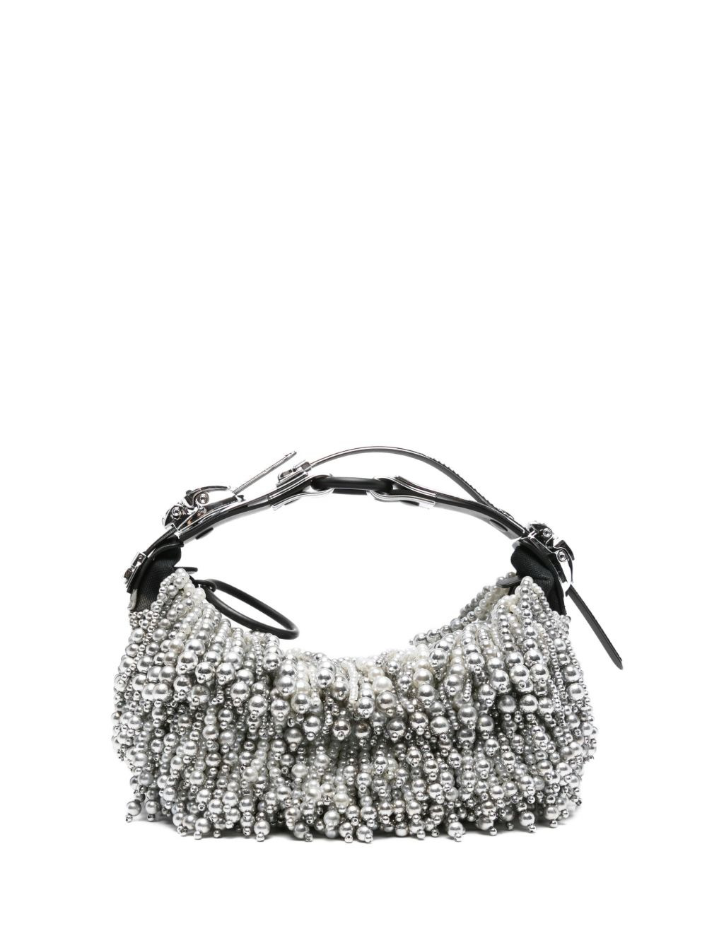 pearl-embellished buckle shoulder bag Highlights - Silver - Pearl embellishment - Curved shape - Buckle fastening - Top handle - Metallic buckle Imported Composition Outer: Polyester 100%, Faux Pearl 100%, Polyurethane 100%, Cotton 100% Lining: Cotton 100% SIZE & FIT Model measurements Height 6 ft 2 in(1.87 m) Bust/Chest 36.41 in(92.5 cm) Hips 37 in(94 cm) Waist 29.52 in(75 cm)