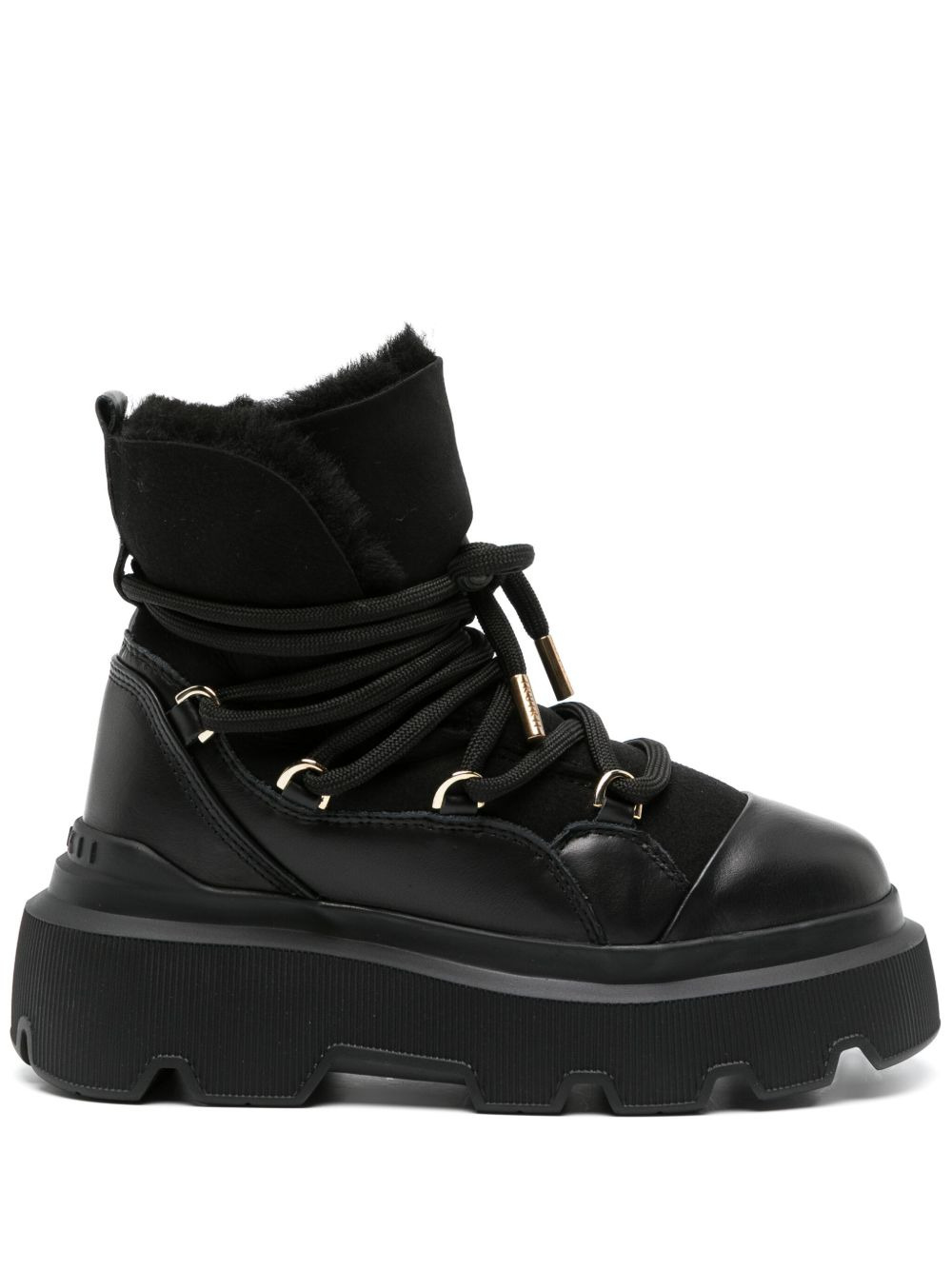 Endurance Trekking lace-up boots Highlights - Black - Calf leather/calf suede - Panelled design - Tonal stitching - Branded heel counter - Round toe - Slip-on style - Pull-tab at the heel - Corded lace-up fastening - Faux-fur lining - Flatform sole Imported Composition Leather 100% SIZE & FIT Measurement HEEL 2.12 in(5.4 cm) PLATFORM 1.37 in(3.5 cm)