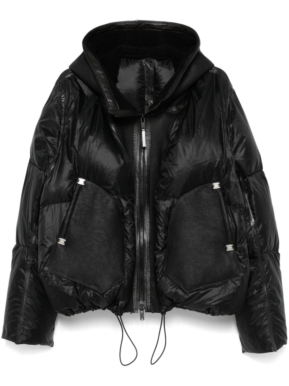 Equivocation puffer jacekt Highlights - Black - Shell - Padded design - Duck down-feather filling - Leather bonded seams - Front two-way zip fastening - Classic hood - Funnel neck - Drop shoulder - Long sleeves - Two front leather patch pockets - Signature applique detail to the back - Full lining - Drawstring hem - When buying this unisex item, keep in mind that it is graded in standard men's sizing. Made in France Composition Outer: Polyamide 100%, Leather 100% Lining: Duck Down 90%, Feather 10% SIZE & FIT Model measurements Height 5 ft 10 in(1.78 m) Bust/Chest 33.07 in(84 cm) Hips 36.61 in(93 cm) Waist 24.8 in(63 cm) Measurement CHEST 47.24 in(120 cm) LENGTH 27.55 in(70 cm) Shoulder Width 21.65 in(55 cm) SLEEVE LENGTH 25.59 in(65 cm) WAIST 51.18 in(130 cm) FittingInformation This unisex piece is only produced in one size; for help with this item's sizing, refer to our product measurements The internal drawstring at the hem allows for fitted preferences Made from a padded non-stretch fabric, giving it no natural elasticity