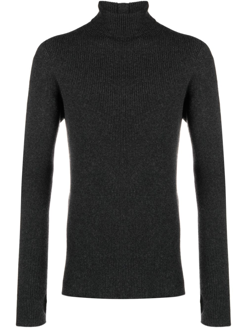 high-neck ribbed-knit jumper Highlights - Anthracite grey - Cashmere - Ribbed knit - Long sleeves - Stirrup cuffs - High neck - Straight hem Made in Italy Composition Cashmere 100% SIZE & FIT Model measurements Height 6 ft 2 in(1.87 m) Bust/Chest 36.41 in(92.5 cm) Hips 37 in(94 cm) Waist 29.52 in(75 cm) FittingInformation Designed for a slim fit, offering a comfortable fit that sits just away from the body Made with a midweight knit, this piece offers some stretch This piece fits true to size – take your usual size Washing instructions Hand Wash