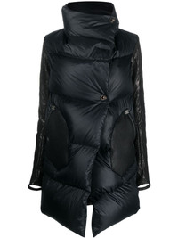 lock-fastening quilted down jacket Highlights - Jet black - Duck down/leather - Quilted finish - Padded design - Asymmetric design - Funnel neck - Off-centre front lock fastening - Contrasting-fabric long sleeves - Thumb slots - Two front patch pockets - Straight hem Made in France Composition Outer: Polyamide 100%, Leather 100% Lining: Duck Down 90%, Feather 10% SIZE & FIT Model measurements Height 5 ft 11 in(1.8 m) Bust/Chest 30.7 in(78 cm) Hips 35.03 in(89 cm) Waist 24.4 in(62 cm) FittingInformation Designed to be unstructured, offering a loose fit throughout Made from a padded non-stretch fabric, giving it no natural elasticity This piece fits true to size – take your usual size Washing instructions Dry Clean Only