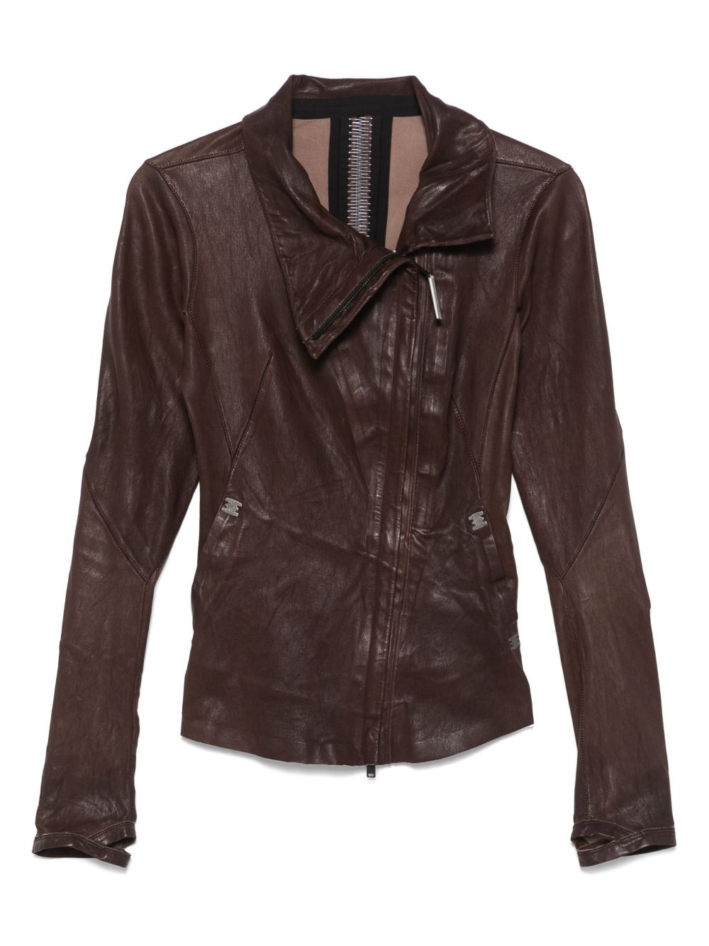Prudente Neo leather jacket Highlights - Chocolate brown - Front zip fastening - Two side welt pockets - Thumb slots - Decorative zip detailing Made in France Composition Lamb Skin 100% SIZE & FIT Model measurements Height 5 ft 9 in(1.75 m) Bust/Chest 34.64 in(88 cm) Hips 36.61 in(93 cm) Waist 26.37 in(67 cm) FittingInformation Designed for a close fit throughout Firm leather offering little flexibility to maintain its durability and sturdiness
