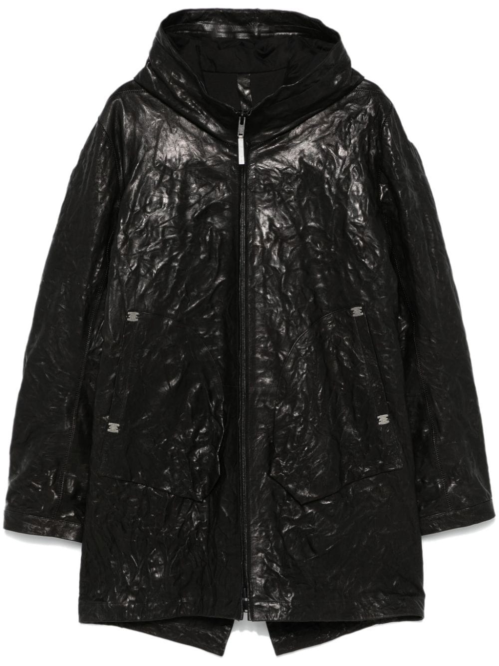 Psycho coat Highlights - Black - Lambskin - Crinkled finish - Front zip fastening - Decorative stitching - Classic hood - Long sleeves - Press-stud fastening cuffs - Two side pouch pockets - Central rear vent - Partial lining - Straight hem Made in France Composition Outer: Lambskin 100% Lining: Satin 100%, Cotton 100% SIZE & FIT Model measurements Height 6 ft 2 in(1.87 m) Bust/Chest 38.97 in(99 cm) Hips 37.99 in(96.5 cm) Waist 29.52 in(75 cm) FittingInformation Designed to be unstructured, offering a loose fit throughout Soft leather has a supple and smooth construction offering some flexibility