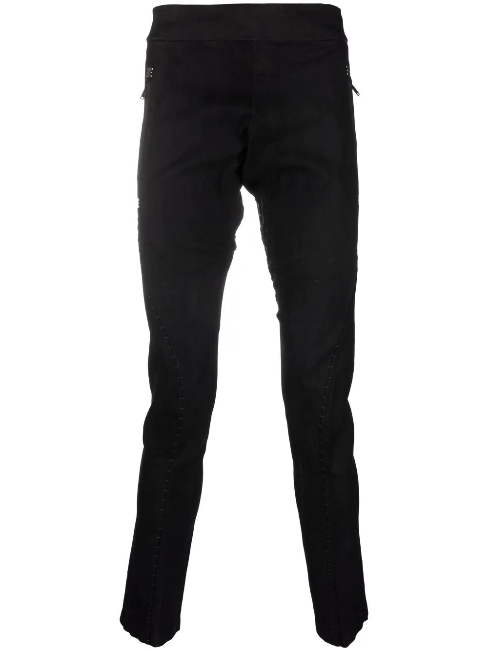slim-cut lambskin trousers jet-black lambskin slim cut two side zip-fastening pockets mid-rise Made in France Composition Lamb Skin 100% SIZE & FIT Model measurements Height 6 ft 1 in(1.85 m) Bust/Chest 37.79 in(96 cm) Hips 37.4 in(95 cm) Waist 30.7 in(78 cm) FittingInformation This piece fits true to size. We recommend you get your regular size Cut for a slim fit Made with a mid-weight fabric Washing instructions Specialist Cleaning
