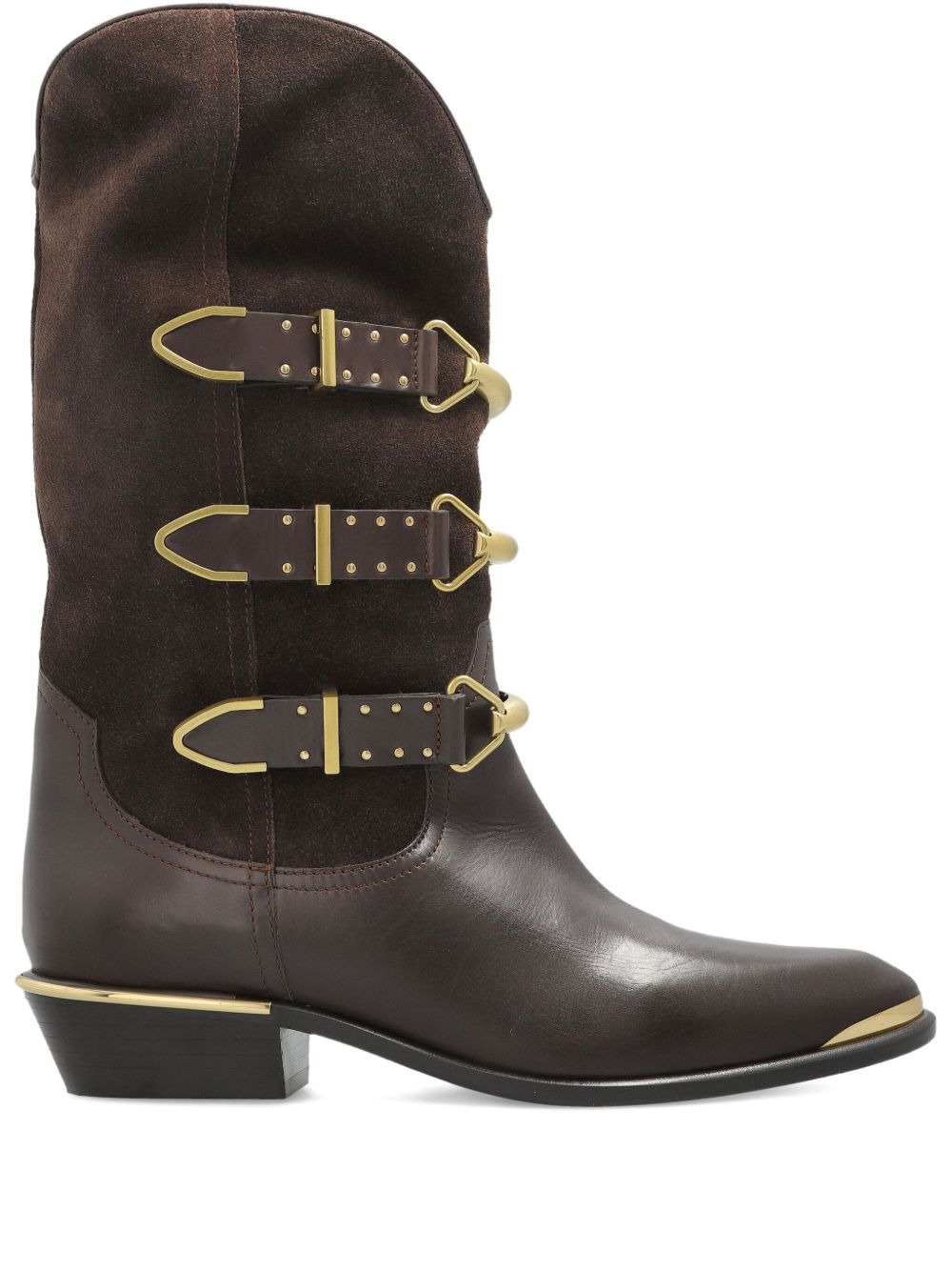 30mm buckle-detail suede leather boots Highlights - Brown - Leather and suede - Multiple buckles - Gold-tone metal accents - Pointed toe - Low heel Made in Italy Composition Outer: Calf Leather 100% Sole: Calf Leather 100% Lining: Calf Leather 100% SIZE & FIT Measurement HEEL 1.18 in(3 cm)