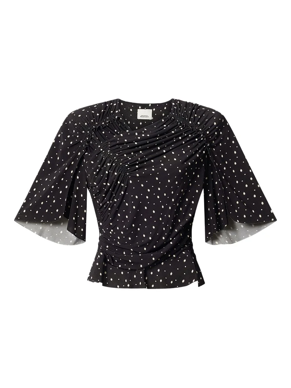 draped polka dot top Highlights - Black - Polka dot pattern - Draped detail - Gathered detail Imported Composition Viscose 94%, Spandex/Elastane 6%