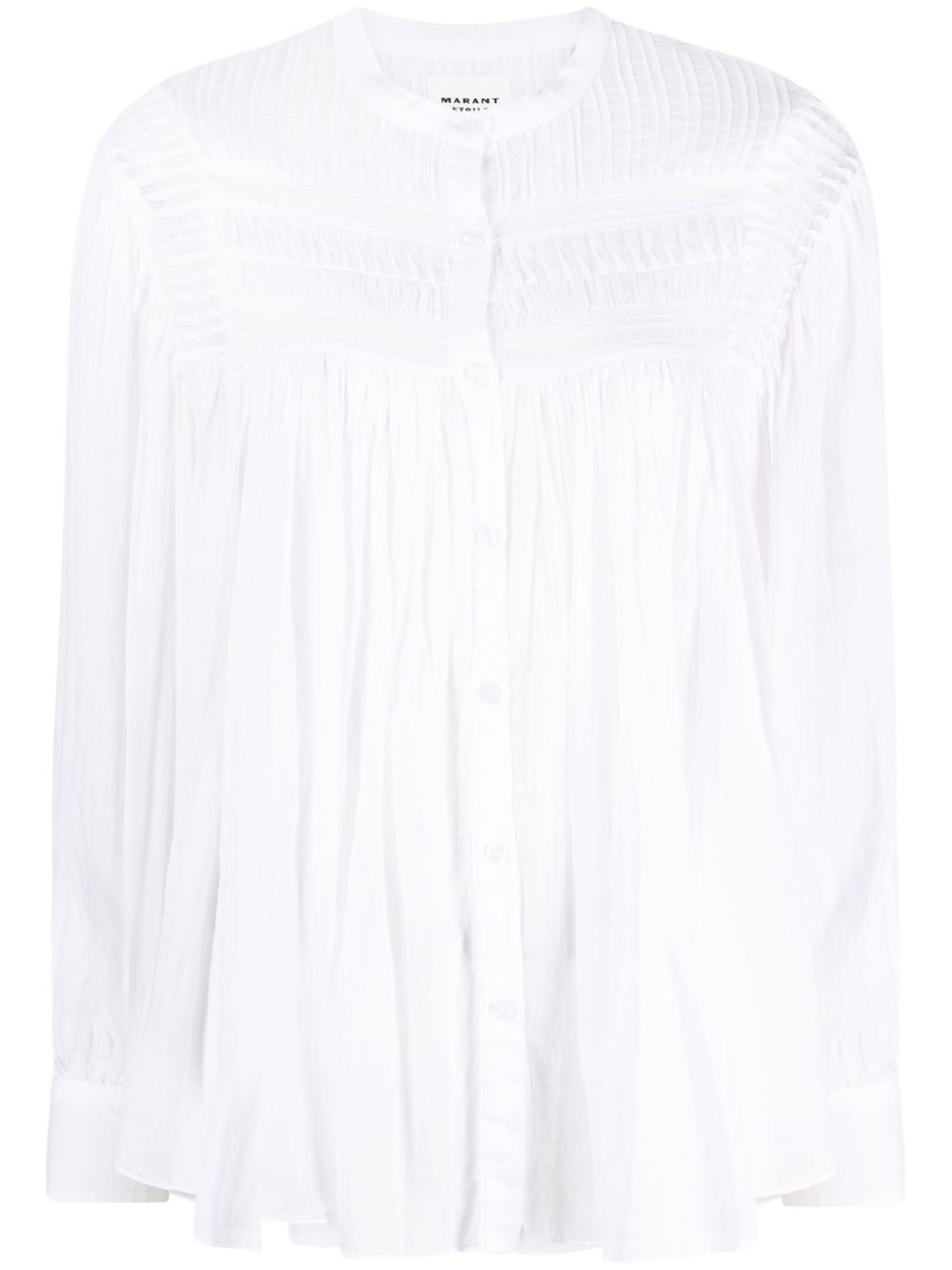 Plalia blouse Isabel Marant Etoile's shirt infuses the classic band-collar shirt with the brand's carefree aesthetic. Notice the pintuck and pleat detailing that create a crinkled effect. Highlights - White - Cotton - Pintuck detailing - Long sleeves - Front button fastening - Buttoned cuffs Imported Composition Cotton 100% SIZE & FIT Model measurements Height 5 ft 10 in(1.77 m) Bust/Chest 32.67 in(83 cm) Hips 35.43 in(90 cm) Waist 23.62 in(60 cm) Measurement LENGTH 27.55 in(70 cm) Washing instructions Machine Wash