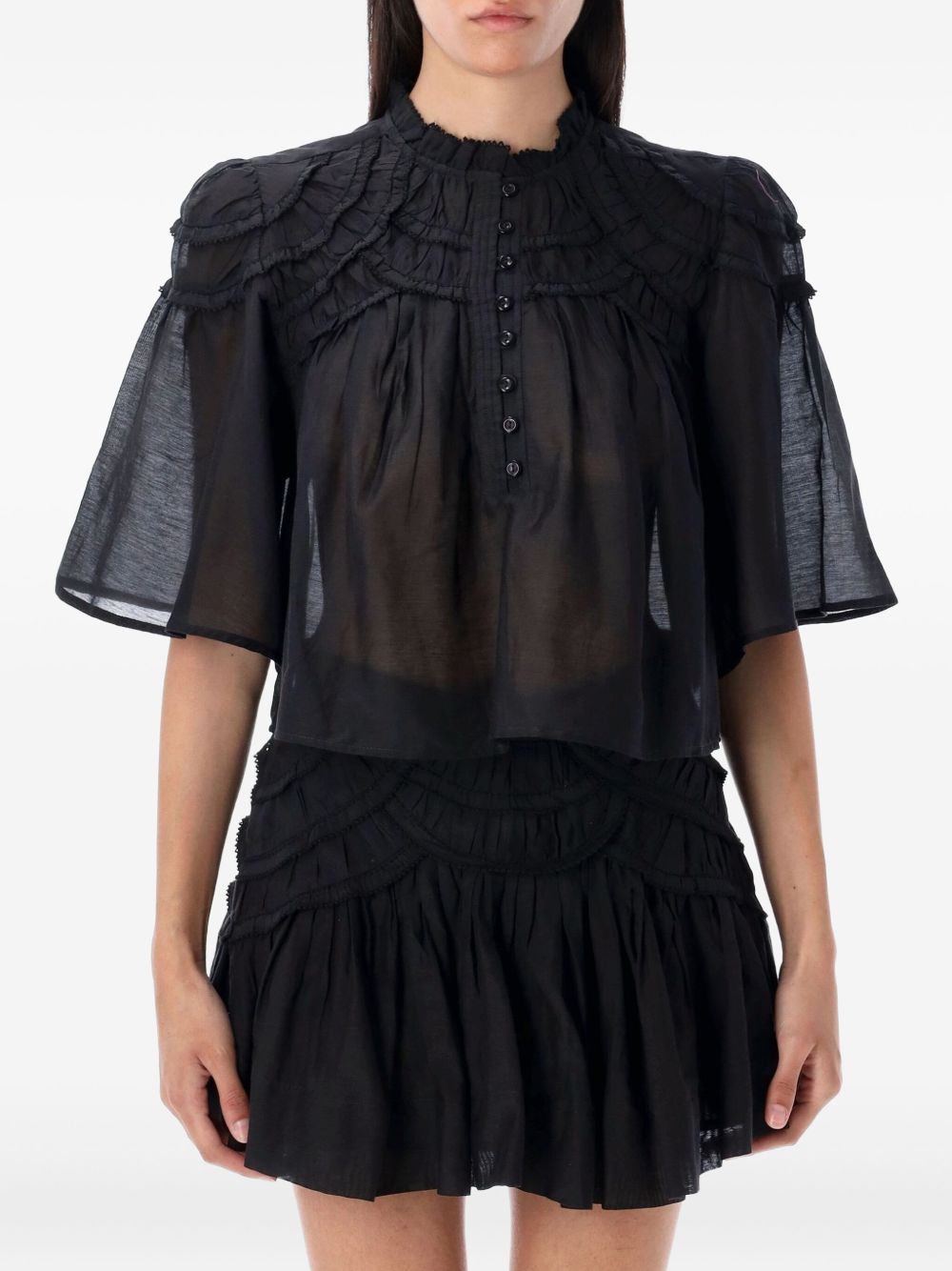 Carmen ruffled-frill blouse Highlights - Black - Ruffled neckline - Frilled shoulders - Button fastening - Short sleeves - Semi-sheer fabric Imported Composition Cotton 80%, viscose 20% Washing instructions Read Manufacturer Guidelines