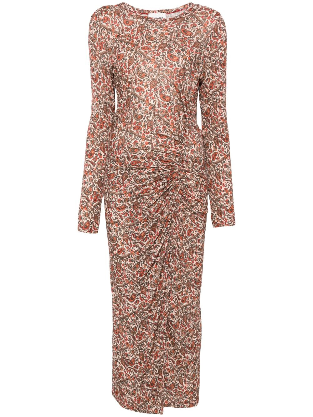 Jelina midi dress Highlights - Rust red - Side slit - Paisley print - Ruched detailing - Long sleeves Imported Composition Fabric 100% SIZE & FIT Model measurements Height 5 ft 10 in(1.78 m) Bust/Chest 33.46 in(85 cm) Hips 36.22 in(92 cm) Waist 23.22 in(59 cm) FittingInformation Designed for a close fit throughout Washing instructions Dry Clean Only